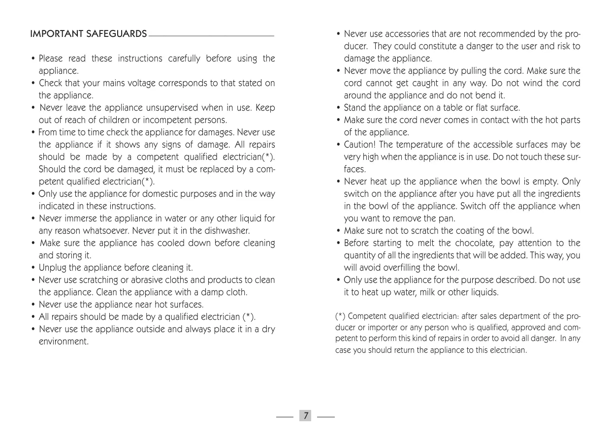 (*) Competent qualified electrician: after sales department of the producer or importer or any person who is qualified, approved and competent to perform this kind of repairs in order to avoid all danger. In any case you should return the appliance to this electrician.