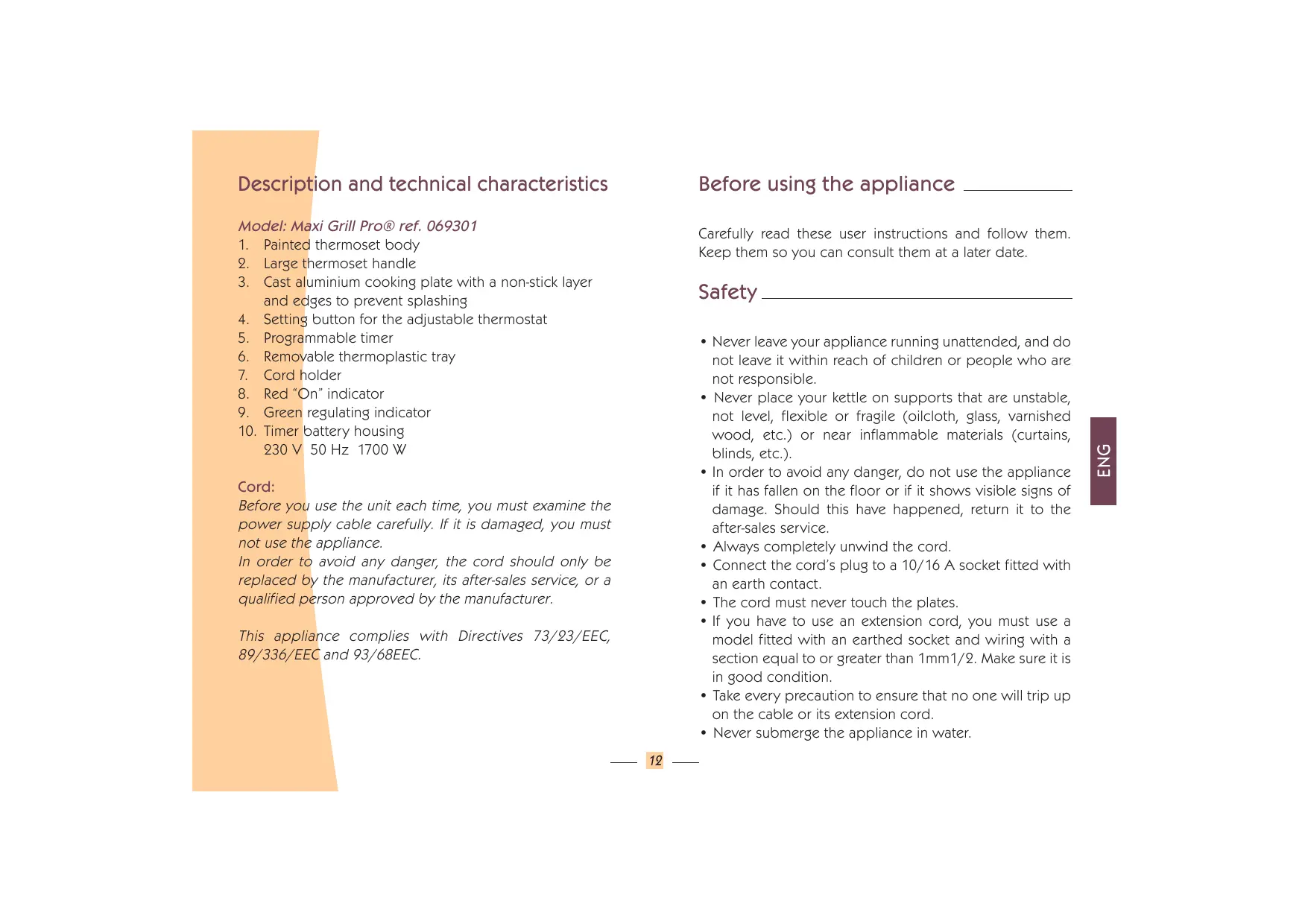 The green indicator may go out and light up during cooking. This is to indicate that the set temperature has been reached. Do not use metal utensils to move the food on the cooking plate as you run the risk of damaging the nonstick coating. Should you throw your apparatus out after many years of service, you should remember to remove the timer’s battery, which should be left at a specialist collection centre.