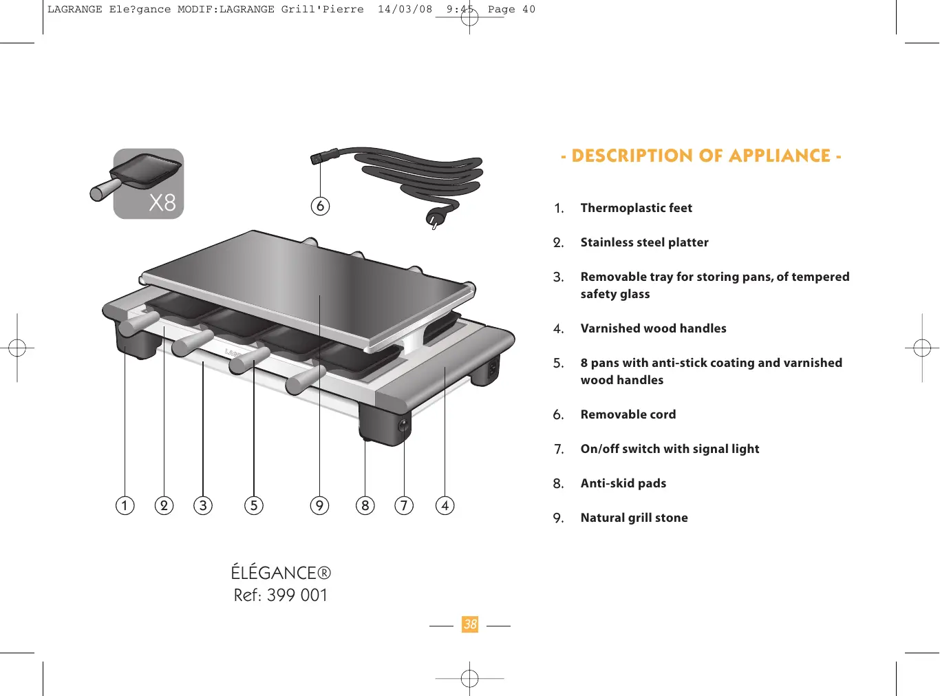 Download the instructions for your Electric grill in PDF format for free! Find your manual RACLETTE PIERRE ELEGANCE - LAGRANGE and take your electronic device back in hand. On this page are published all the documents necessary for the use of your device. RACLETTE PIERRE ELEGANCE by LAGRANGE.