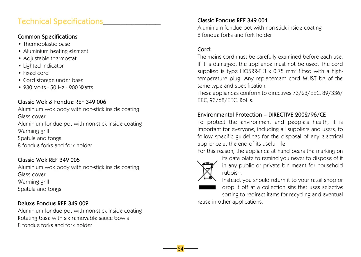 - 230 Volts - 50 Hz - 900 Watts Cord: The mains cord must be carefully examined before each use. If it is damaged, the appliance must not be used. The cord supplied is type HO5RR-F 3 x 0.75 mm2 fitted with a hightemperature plug. Any replacement cord MUST be of the same type and specification. These appliances conform to directives 73/23/EEC, 89/336/ EEC, 93/68/EEC, RoHs. Classic Wok & Fondue REF 349 006 Aluminium wok body with non-stick inside coating Glass cover Aluminium fondue pot with non-stick inside coating Warming grill Spatula and tongs 8 fondue forks and fork holder Environmental Protection – DIRECTIVE 2002/96/CE To protect the environment and people’s health, it is important for everyone, including all suppliers and users, to follow specific guidelines for the disposal of any electrical appliance at the end of its useful life. For this reason, the appliance at hand bears the marking on its data plate to remind you never to dispose of it in any public or private bin meant for household rubbish. Instead, you should return it to your retail shop or drop it off at a collection site that uses selective sorting to redirect items for recycling and eventual reuse in other applications. Classic Wok REF 349 005 Aluminium wok body with non-stick inside coating Glass cover Warming grill Spatula and tongs Deluxe Fondue REF 349 002 Aluminium fondue pot with non-stick inside coating Rotating base with six removable sauce bowls 8 fondue forks and fork holder