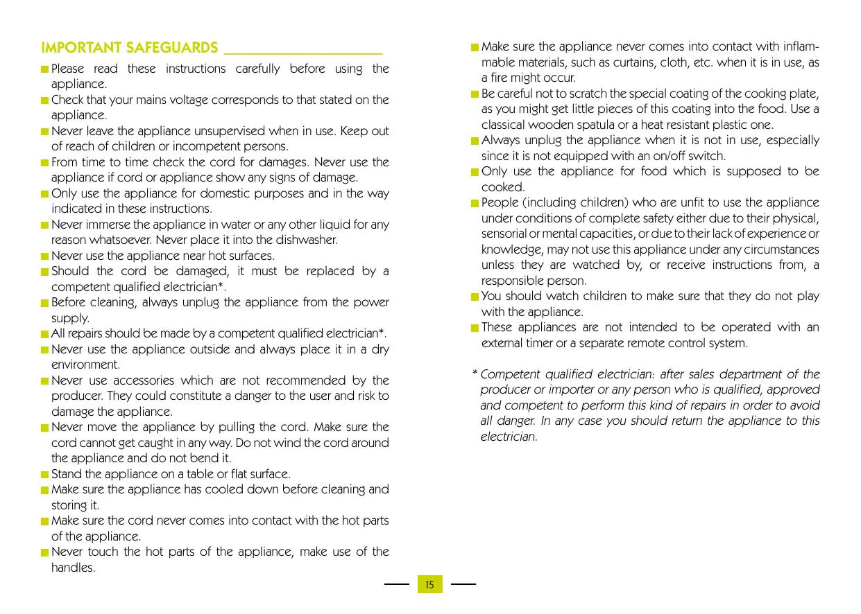 - Competent qualified electrician: after sales department of the producer or importer or any person who is qualified, approved and competent to perform this kind of repairs in order to avoid all danger. In any case you should return the appliance to this electrician.