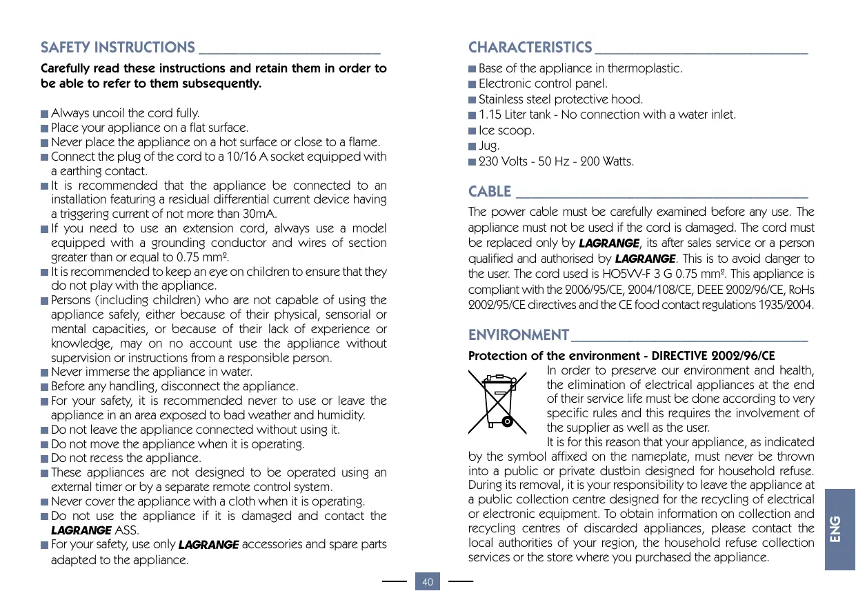 Guarantee conditions_____________________ Your appliance is guaranteed for 2 years. To enjoy an additional year of guarantee free of cost, register on the website (www.lagrange.fr). The guarantee includes parts and labour and covers manufacturing defects. The following are excluded from the guarantee: Damage resulting from incorrect use or failure to respect the operating instructions, and breakage by falling. isconnect the appliance after use. Drain the tank if you won’t be using it immediately. Always wash and dry all components properly before repositioning them. Aerate the appliance without the tray after use so that it dries inside. Disconnect the cord, fold it up, and place it in the dry measuring jug. Place the measuring jug in the ice-tray and re-insert the latter in the appliance. Put away the appliance on a flat and easily accessible surface. Do not put anything on top of the appliance. THIS GUARANTEE APPLIES TO DOMESTIC USE, AND ON NO ACCOUNT TO PROFESSIONAL USE. The legal guarantee owed by the seller in no way excludes the legal guarantee owed by the Manufacturer for faults or manufacturing defects according to articles 1641 and following of the Civil Code. In case of breakdown or malfunction, contact your reseller. In case of a technical fault within 8 days of purchase, the appliances will be exchanged. After this period they will be repaired by the after sales service.