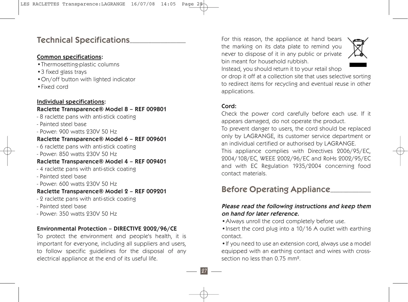 - Fixed cord Individual specifications: Raclette Transparence® Model 8 – REF 009801 - 8 raclette pans with anti-stick coating - Painted steel base - Power: 900 watts 230V 50 Hz Raclette Transparence® Model 6 – REF 009601 - 6 raclette pans with anti-stick coating - Power: 850 watts 230V 50 Hz Raclette Transparence® Model 4 – REF 009401 - 4 raclette pans with anti-stick coating - Painted steel base - Power: 600 watts 230V 50 Hz Raclette Transparence® Model 2 – REF 009201 - 2 raclette pans with anti-stick coating - Painted steel base - Power: 350 watts 230V 50 Hz Cord: Check the power cord carefully before each use. If it appears damaged, do not operate the product. To prevent danger to users, the cord should be replaced only by LAGRANGE, its customer service department or an individual certified or authorised by LAGRANGE. This appliance complies with Directives 2006/95/EC, 2004/108/EC, WEEE 2002/96/EC and RoHs 2002/95/EC and with EC Regulation 1935/2004 concerning food contact materials. Before Operating Appliance_____________ Please read the following instructions and keep them on hand for later reference.