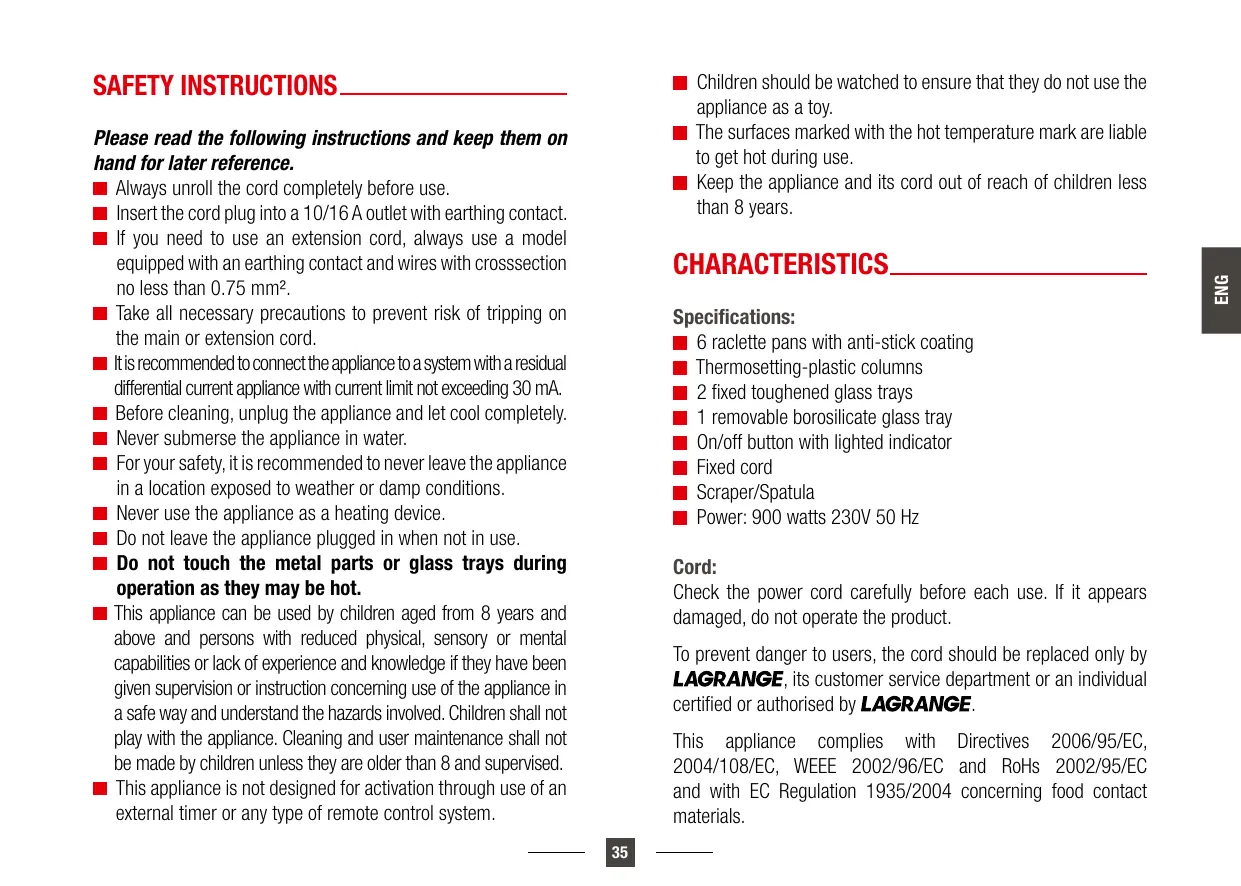 SAFETY INSTRUCTIONS Please read the following instructions and keep them on hand for later reference. Always unroll the cord completely before use. Insert the cord plug into a 10/16 A outlet with earthing contact. If you need to use an extension cord, always use a model equipped with an earthing contact and wires with crosssection no less than 0.75 mm². Take all necessary precautions to prevent risk of tripping on the main or extension cord. It is recommended to connect the appliance to a system with a residual differential current appliance with current limit not exceeding 30 mA. Before cleaning, unplug the appliance and let cool completely. Never submerse the appliance in water. For your safety, it is recommended to never leave the appliance in a location exposed to weather or damp conditions. Never use the appliance as a heating device. Do not leave the appliance plugged in when not in use. Do not touch the metal parts or glass trays during operation as they may be hot. This appliance can be used by children aged from 8 years and above and persons with reduced physical, sensory or mental capabilities or lack of experience and knowledge if they have been given supervision or instruction concerning use of the appliance in a safe way and understand the hazards involved. Children shall not play with the appliance. Cleaning and user maintenance shall not be made by children unless they are older than 8 and supervised. This appliance is not designed for activation through use of an external timer or any type of remote control system. CHARACTERISTICS Specifications: 6 raclette pans with anti-stick coating Thermosetting-plastic columns 2 fixed toughened glass trays 1 removable borosilicate glass tray On/off button with lighted indicator Fixed cord Scraper/Spatula Power: 900 watts 230V 50 Hz Cord: Check the power cord carefully before each use. If it appears damaged, do not operate the product. To prevent danger to users, the cord should be replaced only by , its customer service department or an individual certified or authorised by This appliance complies with Directives 2006/95/EC, 2004/108/EC, WEEE 2002/96/EC and RoHs 2002/95/EC and with EC Regulation 1935/2004 concerning food contact materials.