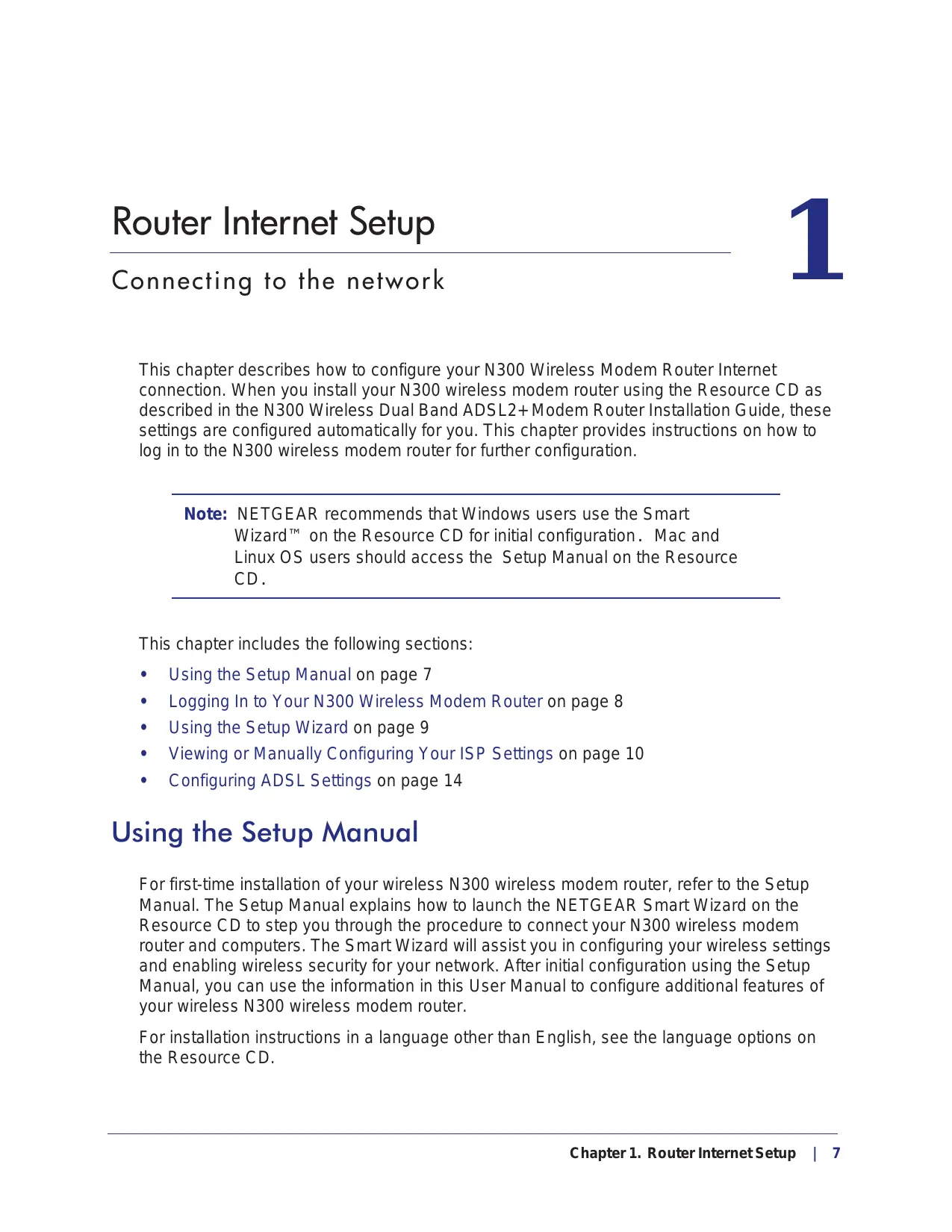 Connecting to the network This chapter describes how to configure your N300 Wireless Modem Router Internet connection. When you install your N300 wireless modem router using the Resource CD as described in the N300 Wireless Dual Band ADSL2+ Modem Router Installation Guide, these settings are configured automatically for you. This chapter provides instructions on how to log in to the N300 wireless modem router for further configuration. Note: NETGEAR recommends that Windows users use the Smart Wizard™ on the Resource CD for initial configuration. Mac and Linux OS users should access the Setup Manual on the Resource CD. This chapter includes the following sections: