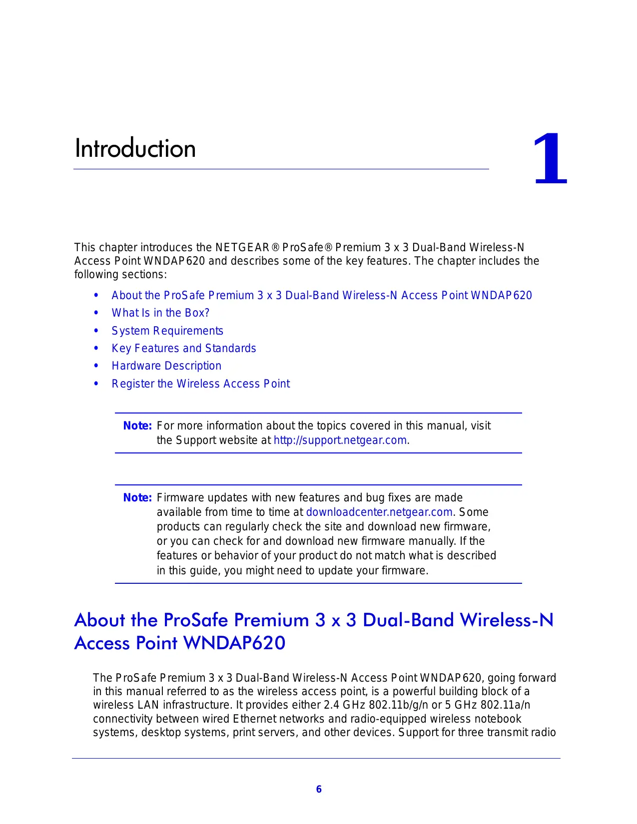 This chapter introduces the NETGEAR® ProSafe® Premium 3 x 3 Dual-Band Wireless-N Access Point WNDAP620 and describes some of the key features. The chapter includes the following sections: