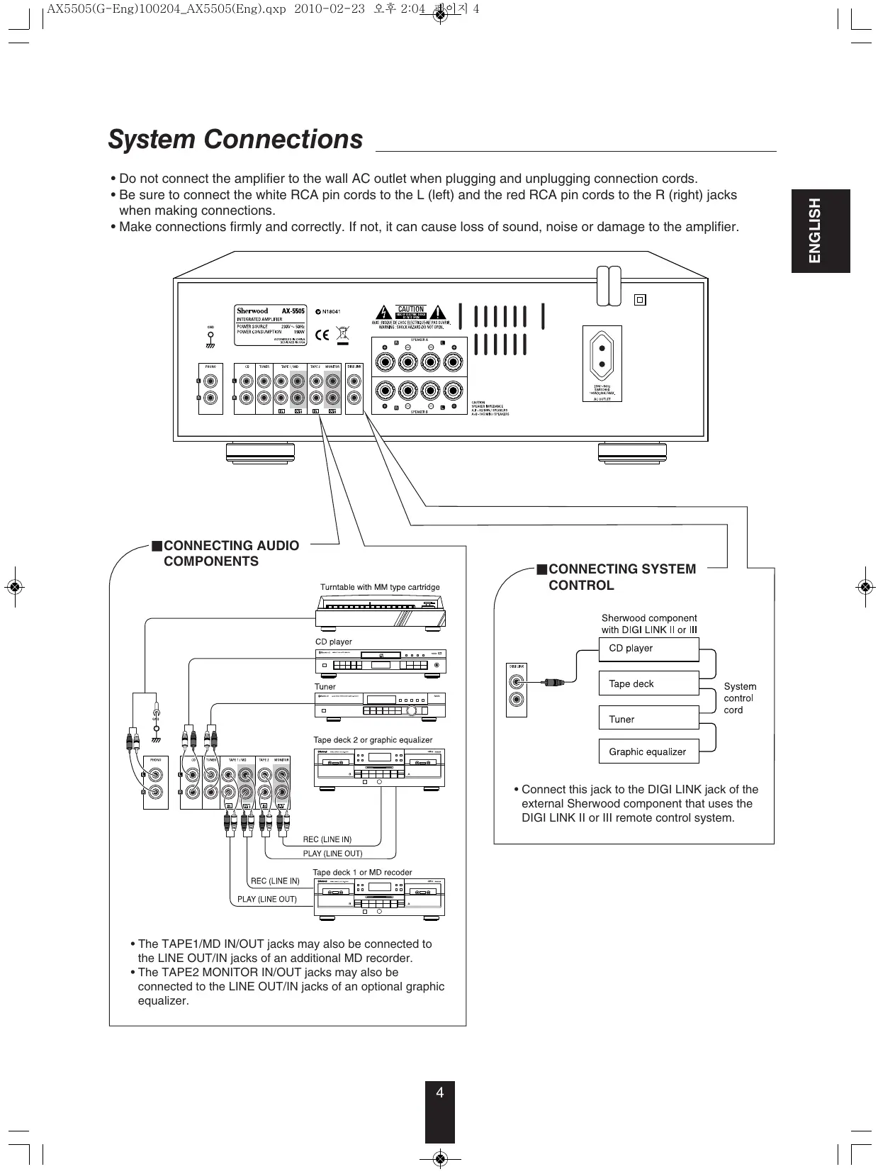 - Make connections firmly and correctly. If not, it can cause loss of sound, noise or damage to the amplifier. ■CONNECTING AUDIO COMPONENTS ■CONNECTING SYSTEM CONTROL