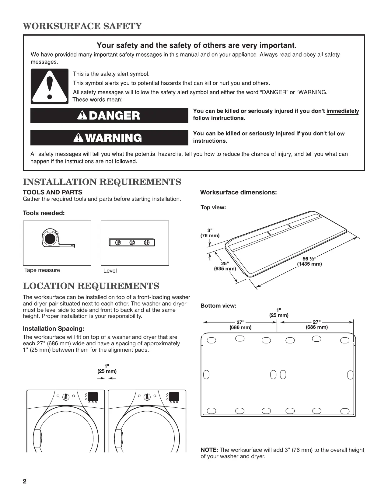 NOTE: The worksurface will add 3" (76 mm) to the overall height of your washer and dryer.