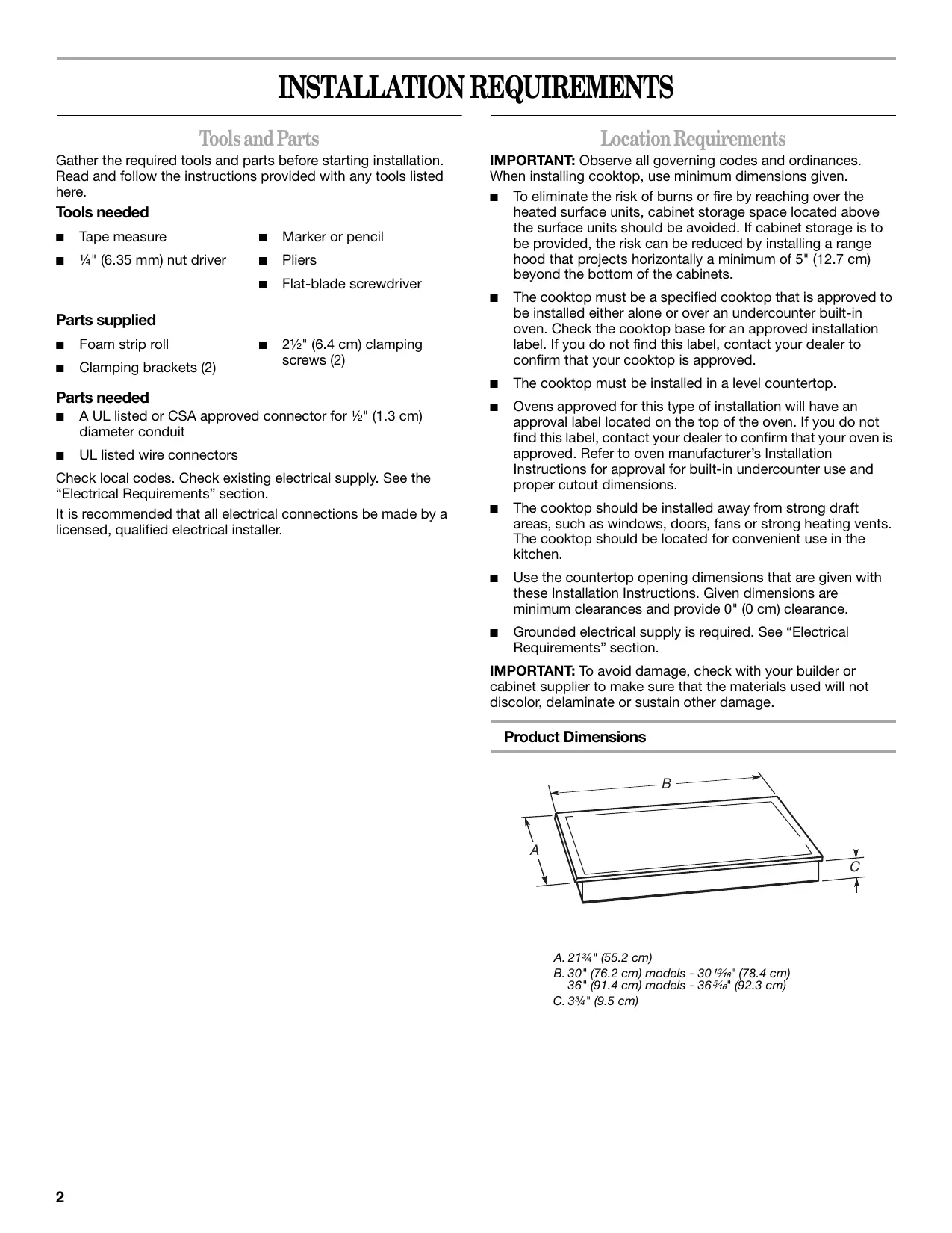 Use the countertop opening dimensions that are given with these Installation Instructions. Given dimensions are minimum clearances and provide 0'' (0 cm) clearance.