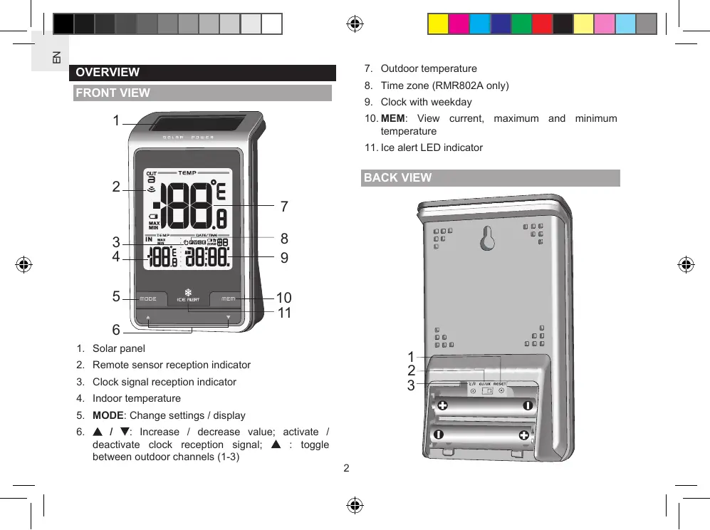 Solar Clock with Indoor / Outdoor About Oregon Scie: Tem pe rature EU-Declaration of Conformity Model:RMR802 / RMR802A FCC Statement Declaration of Conformity. © © N USER MANUAL CONTENTS Overview Front View Back View Remote Sensor & Getting Started Solar Panel Insert Batteries Remote Sensor. Sensor Data Transmission Clock .… Clock Reception Manually Set Clock Temperature .. Ice Warning Reset Precautions NonoununRR À % 4% & & & N NN Specifications .