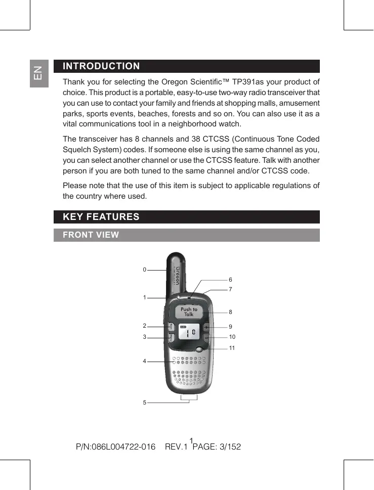 INTRODUCTION Thank you for selecting the Oregon Scientific" TP391as your product of choice. This productis a portable, easy-to-use two-way radio transceiver that you can use to contact your family and friends at shopping malls, amusement parks, sports events, beaches, forests and so on. You can also use it as a vital communications tool in a neighborhood watch. The transceiver has 8 channels and 38 CTCSS (Continuous Tone Coded Squelch System) codes. Ifsomeone else is using the same channel as you, you can select another channel or use the CTCSS feature. Talk with another person if you are both tuned to the same channel and/or CTCSS code. Please note that the use of this item is subject to applicable regulations of the country where used KEY FEATURES