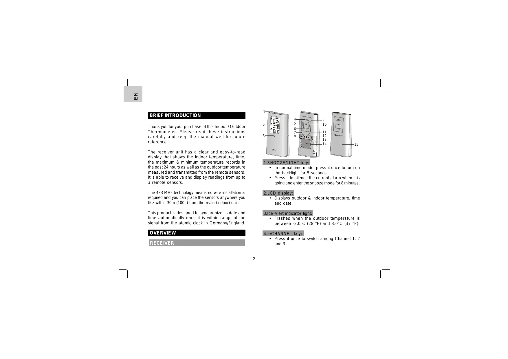 The receiver unit has a clear and easy-to-read display that shows the indoor temperature, time, the maximum & minimum temperature records in the past 24 hours as well as the outdoor temperature measured and transmitted from the remote sensors. It is able to receive and display readings from up to 3 remote sensors. 1.SNOOZE/LIGHT key: