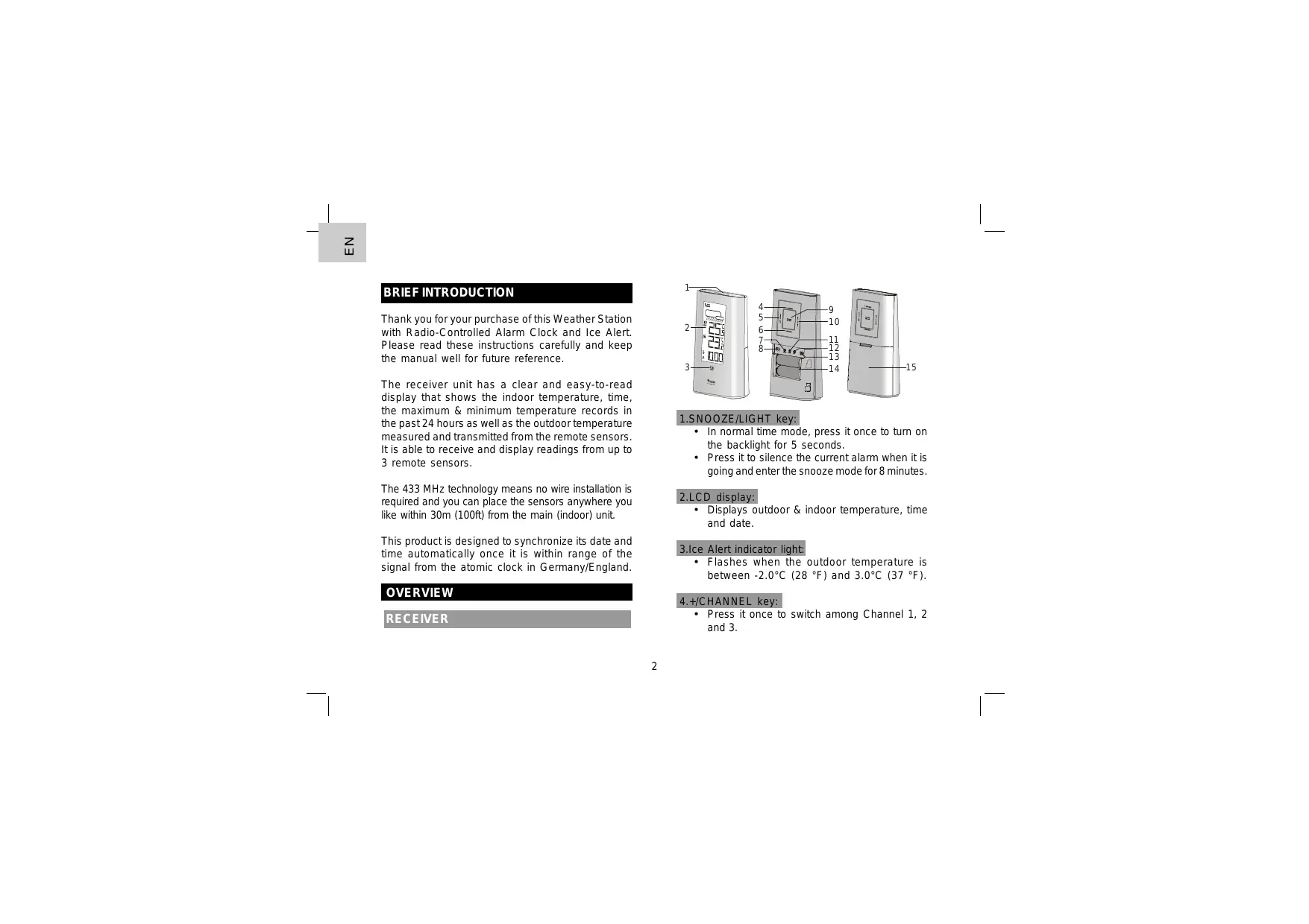 BRIEF INTRODUCTION Thank you for your purchase of this Weather Station with Radio-Controlled Alarm Clock and Ice Alert. Please read these instructions carefully and keep the manual well for future reference.