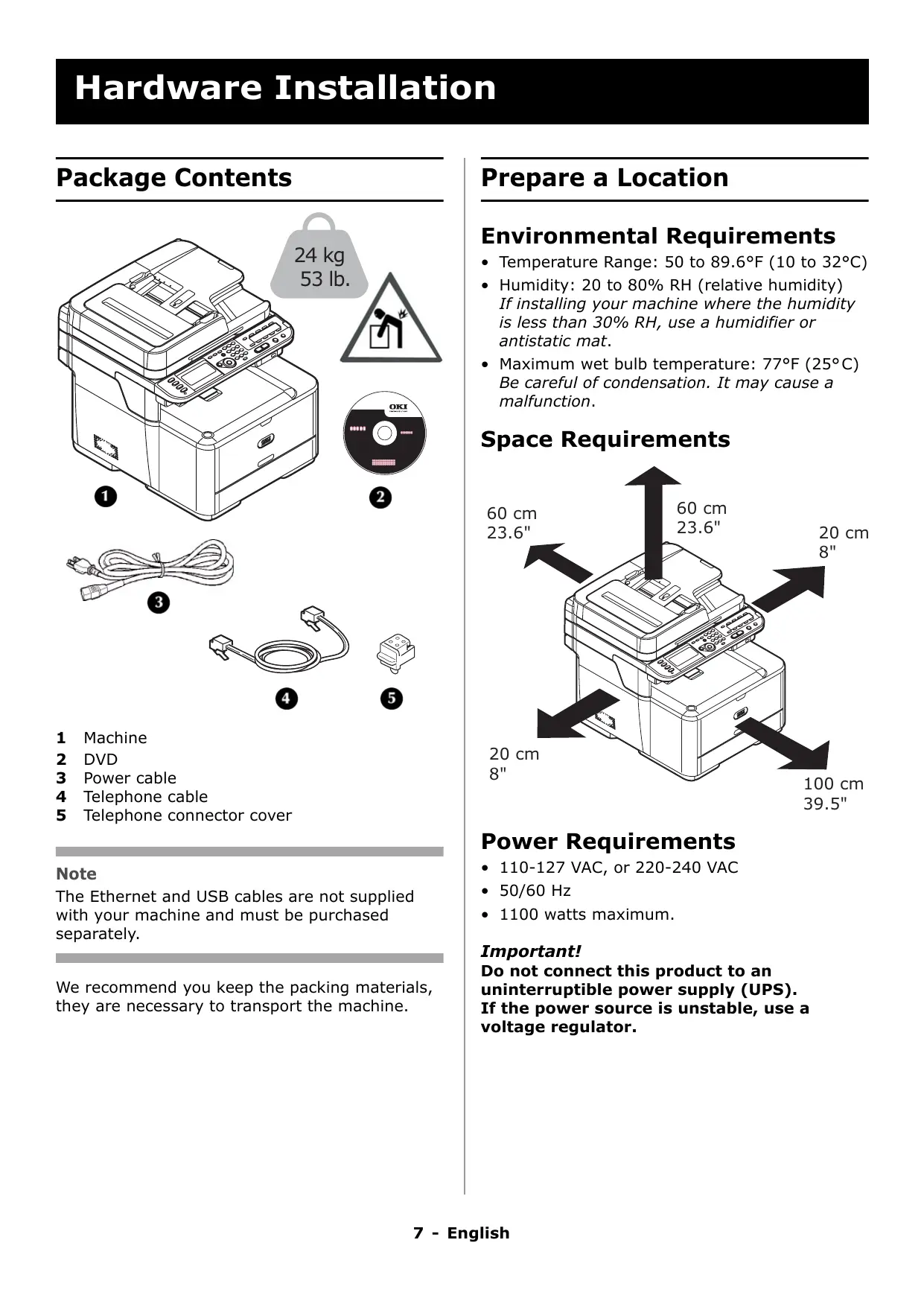 The Ethernet and USB cables are not supplied with your machine and must be purchased separately.