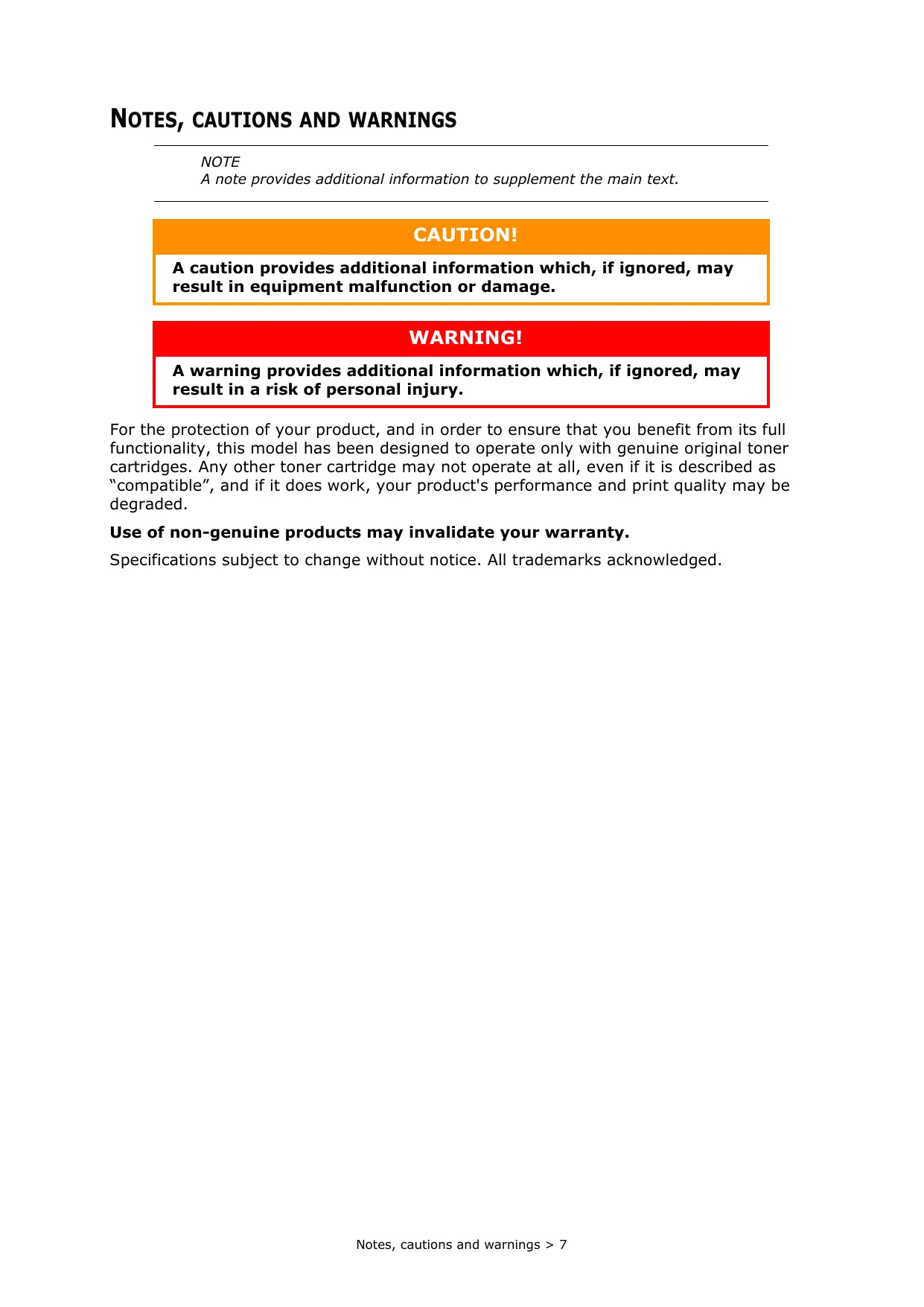 NOTE A note provides additional information to supplement the main text. CAUTION! A caution provides additional information which, if ignored, may result in equipment malfunction or damage. A warning provides additional information which, if ignored, may result in a risk of personal injury. For the protection of your product, and in order to ensure that you benefit from its full functionality, this model has been designed to operate only with genuine original toner cartridges. Any other toner cartridge may not operate at all, even if it is described as “compatible”, and if it does work, your product's performance and print quality may be degraded. Use of non-genuine products may invalidate your warranty. Specifications subject to change without notice. All trademarks acknowledged. Notes, cautions and warnings > 7