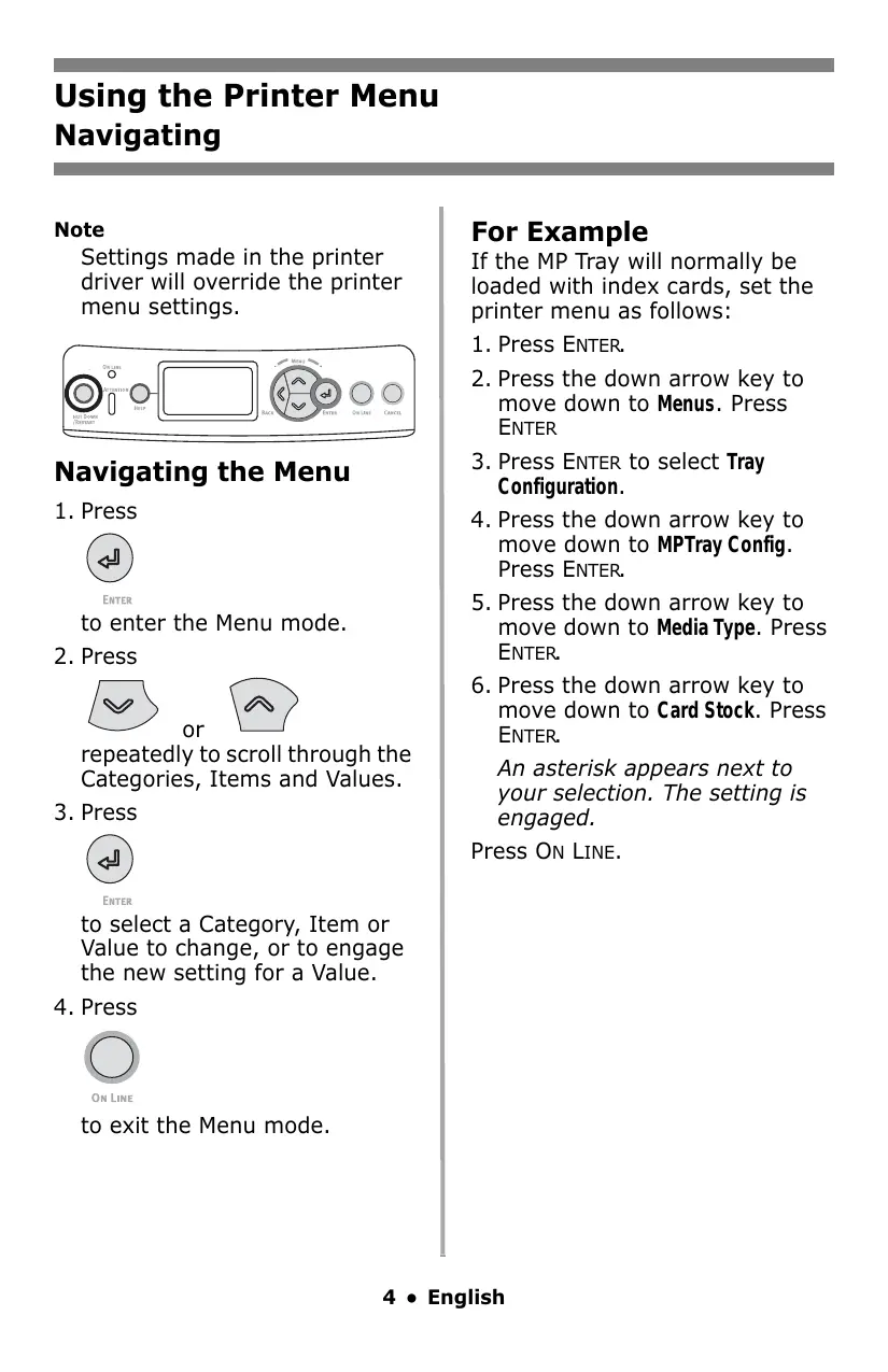 If the MP Tray will normally be loaded with index cards, set the printer menu as follows: