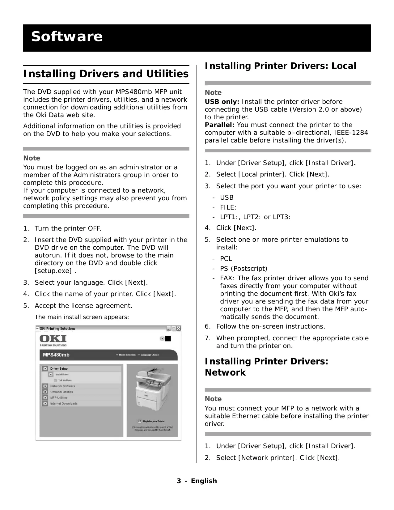 The DVD supplied with your MPS480mb MFP unit includes the printer drivers, utilities, and a network connection for downloading additional utilities from the Oki Data web site.