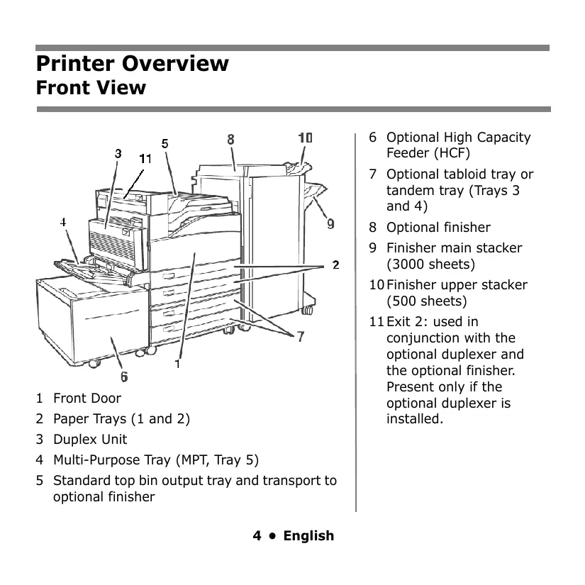 Printer Overview Front View 6 Optional High Capacity Feeder (HCF) 7 Optional tabloid tray or tandem tray (Trays 3 and 4) 8 Optional finisher 9 Finisher main stacker (3000 sheets) 10 Finisher upper stacker (500 sheets) 11 Exit 2: used in conjunction with the optional duplexer and the optional finisher. Present only if the optional duplexer is installed. 1 Front Door 2 Paper Trays (1 and 2) 3 Duplex Unit 4 Multi-Purpose Tray (MPT, Tray 5) 5 Standard top bin output tray and transport to optional finisher 4 • English Printer Overview Operator Panel Overview SELECT Button Press to select the Menu or Submenu shown on the second line of the display or choose and save the setting shown on the second line of the display. READY light Off: printer is idle On: printer is active Blinking: printer is waiting, processing ATTENTION light Off: no error On: there is an error requiring user intervention CANCEL Button Cancel a print job. NEXT/PREVIOUS Buttons Press to move to the Next (!) or Previous (") Menu, Submenu, or Setting within the same level of the menu structure. FORWARD/BACK Buttons Press to move Forward (#) or Back ($) one level in the menu structure to the menu shown on the first line of the display. ON-LINE Button Toggles the printer on-line and offline. MENU Button Press to enter or exit the menu. 5 • English Printer Overview Basic Operator Panel Functions Print a Summary of the Printer’s Settings Reset Printer to Factory Defaults Press the Info button on the Operator Panel to print a configuration summary including: At the Operator Panel: