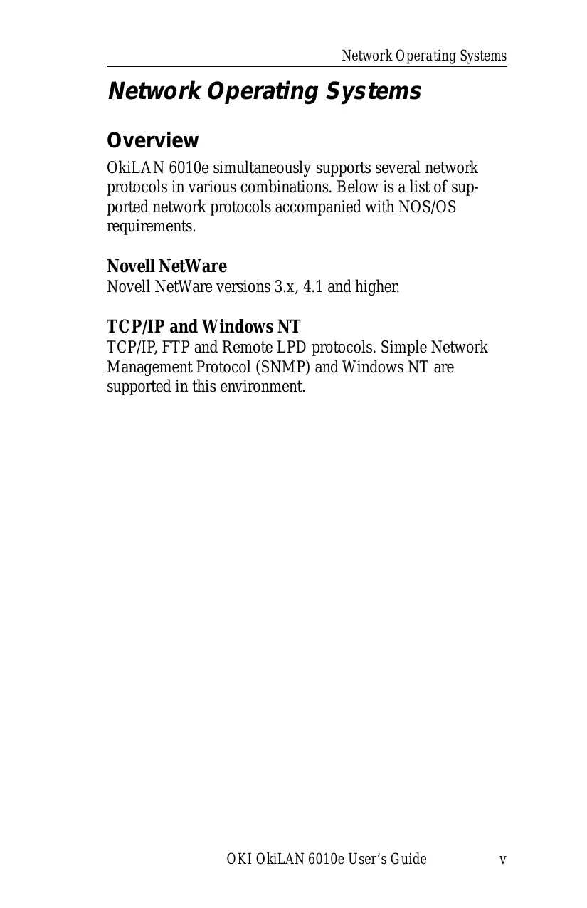 Network Operating Systems Network Operating Systems Overview OkiLAN 6010e simultaneously supports several network protocols in various combinations. Below is a list of sup- ported network protocols accompanied with NOS/OS requirements. Novell NetWare Novell NetWare versions 3.x, 4.1 and higher. TCP/IP and Windows NT TCP/IP, FTP and Remote LPD protocols. Simple Network Management Protocol (SNMP) and Windows NT are supported in this environment. OKI OkiLAN 6010e User’s Guide v