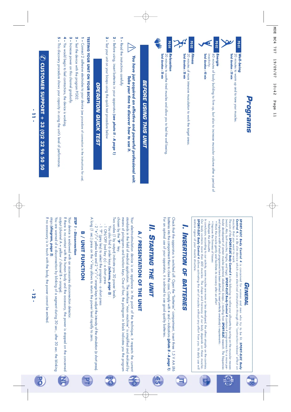 MDE BC4 707 PG 01 PG 02 PG 03 PG 04 19/09/07 Well-being 10:42 Page 11 Programs 20 minutes to warm up and to tone your muscles. Total duration : 20 min Energie 40 minutes of body building to firm up, but also to increase muscular volume after a period of inactivity. Total duration : 40 min Fitness 20 minutes of more intensive musculation to work the target areas. Total duration : 20 min Relaxation 20 minutes to soothe tired muscles and allow you to feel the well beeing. Total duration : 20 min