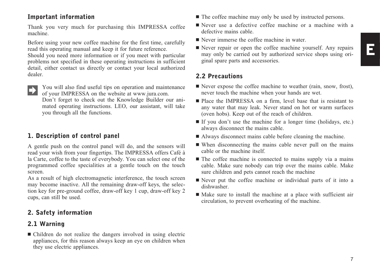 Place the IMPRESSA on a firm, level base that is resistant to any water that may leak. Never stand on hot or warm surfaces (oven hobs). Keep out of the reach of children.