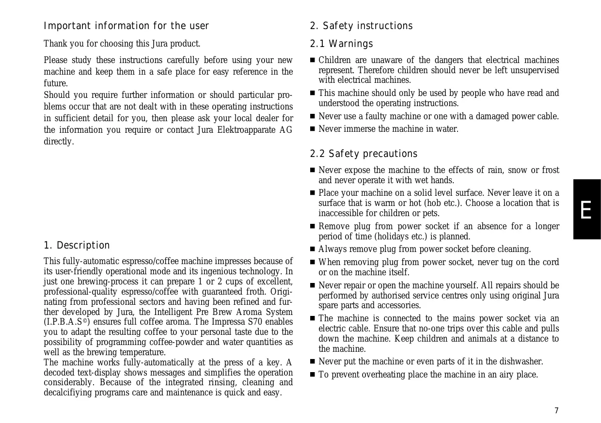 Important information for the user Thank you for choosing this Jura product. Please study these instructions carefully before using your new machine and keep them in a safe place for easy reference in the future. Should you require further information or should particular pro- blems occur that are not dealt with in these operating instructions in sufficient detail for you, then please ask your local dealer for the information you require or contact Jura Elektroapparate AG directly.