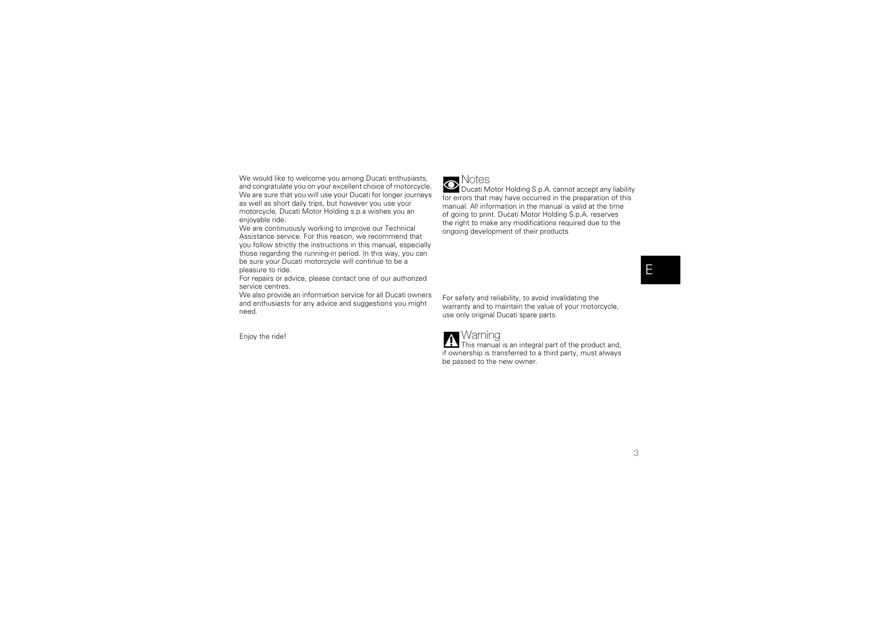 We would like to welcome you among Ducati enthusiasts, and congratulate you on your excellent choice of motorcycle. We are sure that you will use your Ducati for longer journeys as well as short daily trips, but however you use your motorcycle, Ducati Motor Holding s.p.a wishes you an enjoyable ride. We are continuously working to improve our Technical Assistance service. For this reason, we recommend that vou follow strictiy the instructions in this manual, especially those regarding the running-n period. In this way, you can be sure your Ducati motorcycle will continue to be a pleasure to ride. For repairs or advice, please contact one of our authorized service centres We also provide an information service for all Ducati owners and enthusiasts for any advice and suggestions you might need. Enjoy the ride! Notes Ducati Motor Holding S.p.A. cannot accept any liability for errors that may have occurred in the preparation of this manual. All information in the manual is valid at the time of going to print. Ducati Motor Holding S.p.A. reserves the right to make any modifications required due to the ongoing development of their products. For safety and reliability, to avoid invalidating the warranty and to maintain the value of your motorcycle, use only original Ducati spare parts Waming This manual is an integral part of the product and, if ownership is transferred to a third party, must always be passed to the new owner.