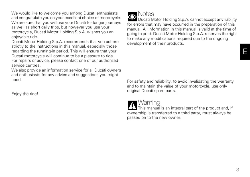 We would like to welcome you among Ducati enthusiasts and congratulate you on your excellent choice of motorcycle. We are sure that you will use your Ducati for longer journeys as well as short daily trips, but however you use your motorcycle, Ducati Motor Holding S.p.A. wishes you an enjoyable ride. Ducati Motor Holding S.p.A. recommends that you adhere strictly to the instructions in this manual, especially those regarding the running-in period. This will ensure that your Ducati motorcycle wil continue to be a pleasure to ride For repairs or advice, please contact one of our authorized service centres. We also provide an information service for all Ducati owners and enthusiasts for any advice and suggestions you might need. Enjoy the ridel Notes Ducati Motor Holding S.p.A. cannot accept any liability. for errors that may have occurred in the preparation of this manual. AIl information in this manual is valid at the time of going to print. Ducati Motor Holding S.p.A. reserves the right to make any modifications required due to the ongoing development of their products. For safety and reliability, to avoid invalidating the warranty and to maintain the value of your motorcycle, use only original Ducati spare parts. Waming This manual is an integral part of the product and, if ownership is transferred to a third party, must always be passed on to the new owner.