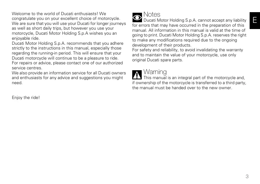 Welcome ta the world of Ducati enthusiasts! We congratulate you on your excellent choice of motorcycle. We are sure that you will use your Ducati for longer journeys as well as short daily trips, but however you use your motorcycle, Ducati Motor Holding S.p.A wishes you an enjoyable ride. Ducati Motor Holding S.p.A. recommends that you adhere strictly to the instructions in this manual, especially those regarding the running-in period. This will ensure that your Ducati motorcycle wil continue to be a pleasure to ride For repairs or advice, please contact one of our authorized service centres. We also provide an information service for all Ducati owners and enthusiasts for any advice and suggestions you might need. Enjoy the ridel Notes Ducati Motor Holding S.p.A. cannot accept any liability. for errors that may have occurred in the preparation of this manual. AIl information in this manual is valid at the time of going to print. Ducati Motor Holding S.p.A. reserves the right to make any modifications required due to the ongoing development of their products. For safety and reliability, to avoid invalidating the warranty and to maintain the value of your motorcycle, use only original Ducati spare parts. Waming This manual is an integral part of the motorcycle and, if ownership of the motorycle is transferred to a third party, the manual must be handed over to the new owner.