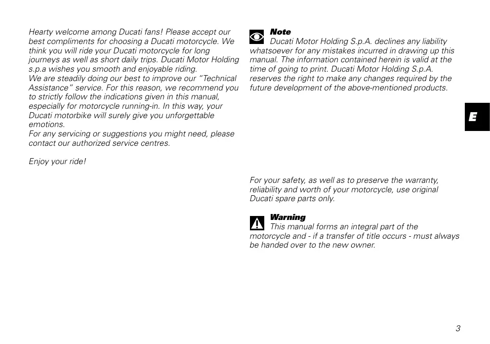 Note Ducati Motor Holding S.p.A. declines any liability Hearty welcome among Ducati fans! Please accept our best compliments for choosing à Ducati motorcycle. We think you will ride your Ducati motorcycle for long whatsoever for any mistakes incurred in drawing up this journeys as well as short daily trips. Ducati Motor Holding manuel. The information contained herein is valid at the $.p.a wishes you smooth and enjoyable riding. time of going to print. Ducati Motor Holding S.p.A We are steadily doing our best to improve our “Technical … reserves the right to make any changes required by the Assistance” service. For this reason, we recommend you … future development of the above-mentioned products. to strictly follow the indications given in this manual, especially for motorcycle running-in. In this way, your Ducati motorbike will surely give you unforgettable emotions. For any Servicing or suggestions you might need, please contact our authorized service centres. Enjoy your ride! For your safety, as well as to preserve the warranty, reliability and worth of your motorcycle, use original Ducati spare parts only.