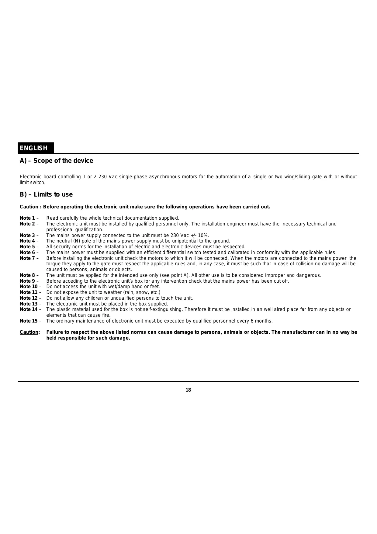 Note 8 – Note 9 – Note 10 – Note 11 – Note 12 – Note 13 – Note 14 – Note 15 – Caution: Read carefully the whole technical documentation supplied. The electronic unit must be installed by qualified personnel only. The installation engineer must have the necessary technical and professional qualification. The mains power supply connected to the unit must be 230 Vac +/- 10%. The neutral (N) pole of the mains power supply must be unipotential to the ground. All security norms for the installation of electric and electronic devices must be respected. The mains power must be supplied with an efficient differential switch tested and calibrated in conformity with the applicable rules. Before installing the electronic unit check the motors to which it will be connected. When the motors are connected to the mains power the torque they apply to the gate must respect the applicable rules and, in any case, it must be such that in case of collision no damage will be caused to persons, animals or objects. The unit must be applied for the intended use only (see point A). All other use is to be considered improper and dangerous. Before acceding to the electronic unit’s box for any intervention check that the mains power has been cut off. Do not access the unit with wet/damp hand or feet. Do not expose the unit to weather (rain, snow, etc.) Do not allow any children or unqualified persons to touch the unit. The electronic unit must be placed in the box supplied. The plastic material used for the box is not self-extinguishing. Therefore it must be installed in an well aired place far from any objects or elements that can cause fire. The ordinary maintenance of electronic unit must be executed by qualified personnel every 6 months. Failure to respect the above listed norms can cause damage to persons, animals or objects. The manufacturer can in no way be held responsible for such damage.