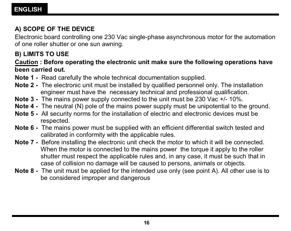 Caution : Before operating the electronic unit make sure the following operations have been carried out. Note 1 - Read carefully the whole technical documentation supplied. Note 2 - The electronic unit must be installed by qualified personnel only. The installation engineer must have the necessary technical and professional qualification. Note 3 - The mains power supply connected to the unit must be 230 Vac +/- 10%. Note 4 - The neutral (N) pole of the mains power supply must be unipotential to the ground. Note 5 - All security norms for the installation of electric and electronic devices must be respected. Note 6 - The mains power must be supplied with an efficient differential switch tested and calibrated in conformity with the applicable rules. Note 7 - Before installing the electronic unit check the motor to which it will be connected. When the motor is connected to the mains power the torque it apply to the roller shutter must respect the applicable rules and, in any case, it must be such that in case of collision no damage will be caused to persons, animals or objects. Note 8 - The unit must be applied for the intended use only (see point A). All other use is to be considered improper and dangerous