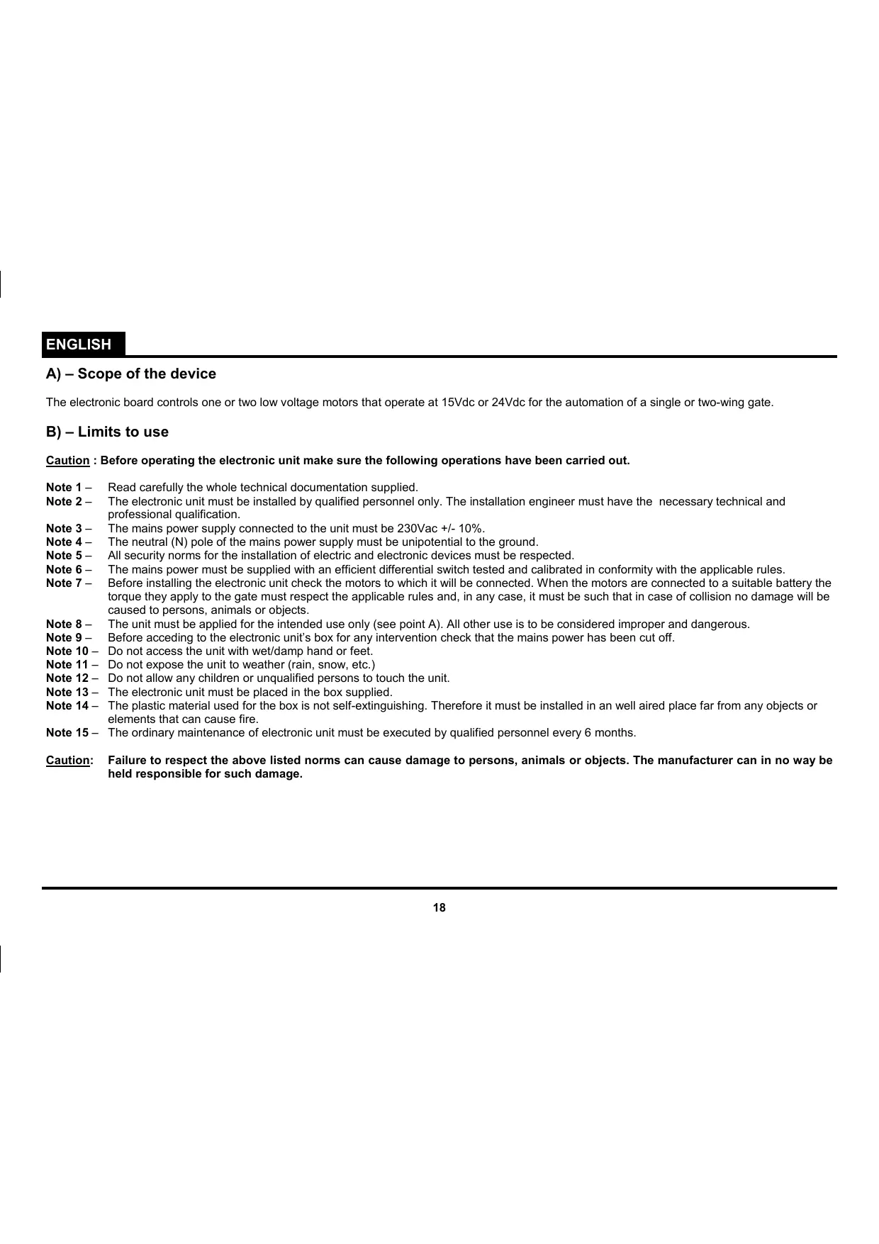ENGLISH A) – Scope of the device The electronic board controls one or two low voltage motors that operate at 15Vdc or 24Vdc for the automation of a single or two-wing gate. B) – Limits to use Caution : Before operating the electronic unit make sure the following operations have been carried out. Note 1 – Note 2 – Note 3 – Note 4 – Note 5 – Note 6 – Note 7 – Note 8 – Note 9 – Note 10 – Note 11 – Note 12 – Note 13 – Note 14 – Note 15 – Caution: Read carefully the whole technical documentation supplied. The electronic unit must be installed by qualified personnel only. The installation engineer must have the necessary technical and professional qualification. The mains power supply connected to the unit must be 230Vac +/- 10%. The neutral (N) pole of the mains power supply must be unipotential to the ground. All security norms for the installation of electric and electronic devices must be respected. The mains power must be supplied with an efficient differential switch tested and calibrated in conformity with the applicable rules. Before installing the electronic unit check the motors to which it will be connected. When the motors are connected to a suitable battery the torque they apply to the gate must respect the applicable rules and, in any case, it must be such that in case of collision no damage will be caused to persons, animals or objects. The unit must be applied for the intended use only (see point A). All other use is to be considered improper and dangerous. Before acceding to the electronic unit’s box for any intervention check that the mains power has been cut off. Do not access the unit with wet/damp hand or feet. Do not expose the unit to weather (rain, snow, etc.) Do not allow any children or unqualified persons to touch the unit. The electronic unit must be placed in the box supplied. The plastic material used for the box is not self-extinguishing. Therefore it must be installed in an well aired place far from any objects or elements that can cause fire. The ordinary maintenance of electronic unit must be executed by qualified personnel every 6 months. Failure to respect the above listed norms can cause damage to persons, animals or objects. The manufacturer can in no way be held responsible for such damage.