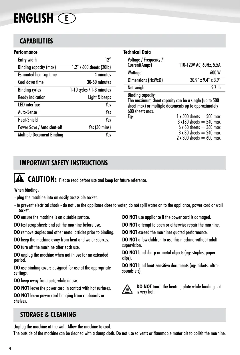 Technical Data Voltage / Frequency / Curent{Amp) 110-120V AC, 60Hz, 5.5A Wattage 600W Dimensions (HxWxD} 209" x94"x39" Net weight 571b Binding capacity The maximum sheet capacity can be a single (up to 500 sheet max) or multiple documents up to approximately 600 sheets max. Eg: 1 x.500 sheets = 500 max 3x180 sheets = 540 max 6x 60 sheets — 360 mox 8 x 30 sheets — 240 max 2 x 300 sheets = 600 max CAUTION: Plense read before use and keep for future reference. When binding; - plug the machine into an easily accessible socket. - to prevent electrical shock - do not use the appliance close to water, do not spill water on to the appliance, power cord or wall socket. DO ensure the machine is on a stable surface. DO test scrap sheets and set the machine before use. DO remove staples and other metal articles prior to binding. DO keep the machine away from heat and water sources. DO turn off the machine after each use. DO unplug the machine when not in us for an extended period. DO use binding covers designed for use at the appropriate sehtings. DO keep away from pets, wie in use. DO NOT leave the power cord in contact with hot surfaces. DO NOT leave pouer cord hanging from eupboards or shees. STORAGE & CLEANING Unplug the machine at the wall. Allow the machine to cool. DO NOT use applianee if the power cord is damaged. DO NOT aïtempt to open or otherwise repair the machine. DO NOT exceed the machines quoted performante. DO NOT allow children to use this machine without adult supervision. po or bind sharp or metal objects (eg: staples, paper dips). DO NOT bind heat-sensitive documents (eg: tickets, ultra- sounds etc).