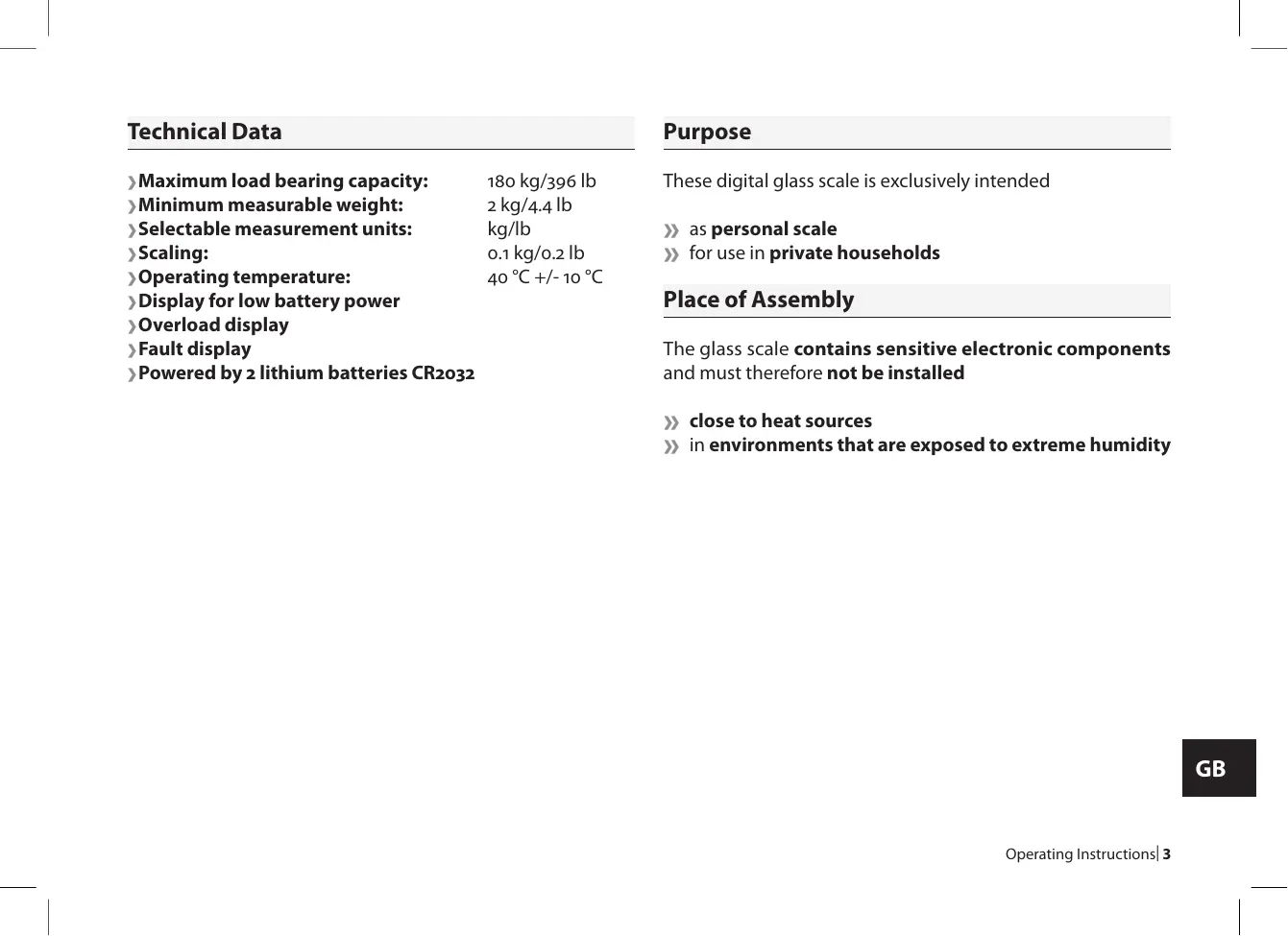 | Operating Instructions Technical Data ›Maximum load bearing capacity: ›Minimum measurable weight: ›Selectable measurement units: ›Scaling: › Operating temperature: › Display for low battery power › Overload display › Fault display › Powered by lithium batteries CR Purpose kg/ lb kg/. lb kg/lb . kg/. lb °C +/- °C These digital glass scale is exclusively intended » as personal scale » for use in private households Place of Assembly The glass scale contains sensitive electronic components and must therefore not be installed » close to heat sources » in environments that are exposed to extreme humidity