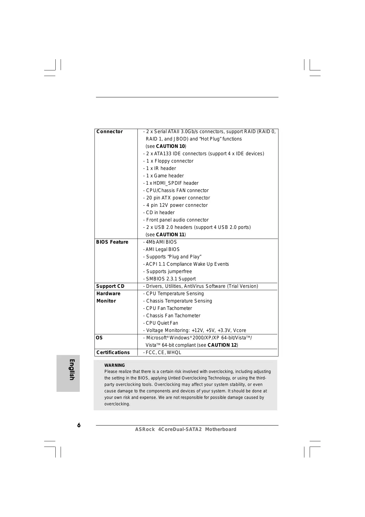 ASRock 4CoreDual-SATA2 Motherboard English VistaTM 64-bit / VistaTM / XP 64-bit / XP SP1 or SP2 / 2000 SP4.