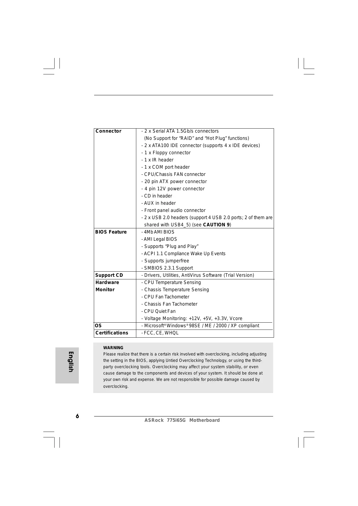 WARNING Please realize that there is a certain risk involved with overclocking, including adjusting the setting in the BIOS, appiying Untied Overclocking Technology, or using the third- party overclocking tools. Overclocking may affect your system stability, or even cause damage to the components and devices of your system. lt should be done at your own risk and expense. We are notresponsible for possible damage caused by overclocking. ASRock 775i65G Motherboard