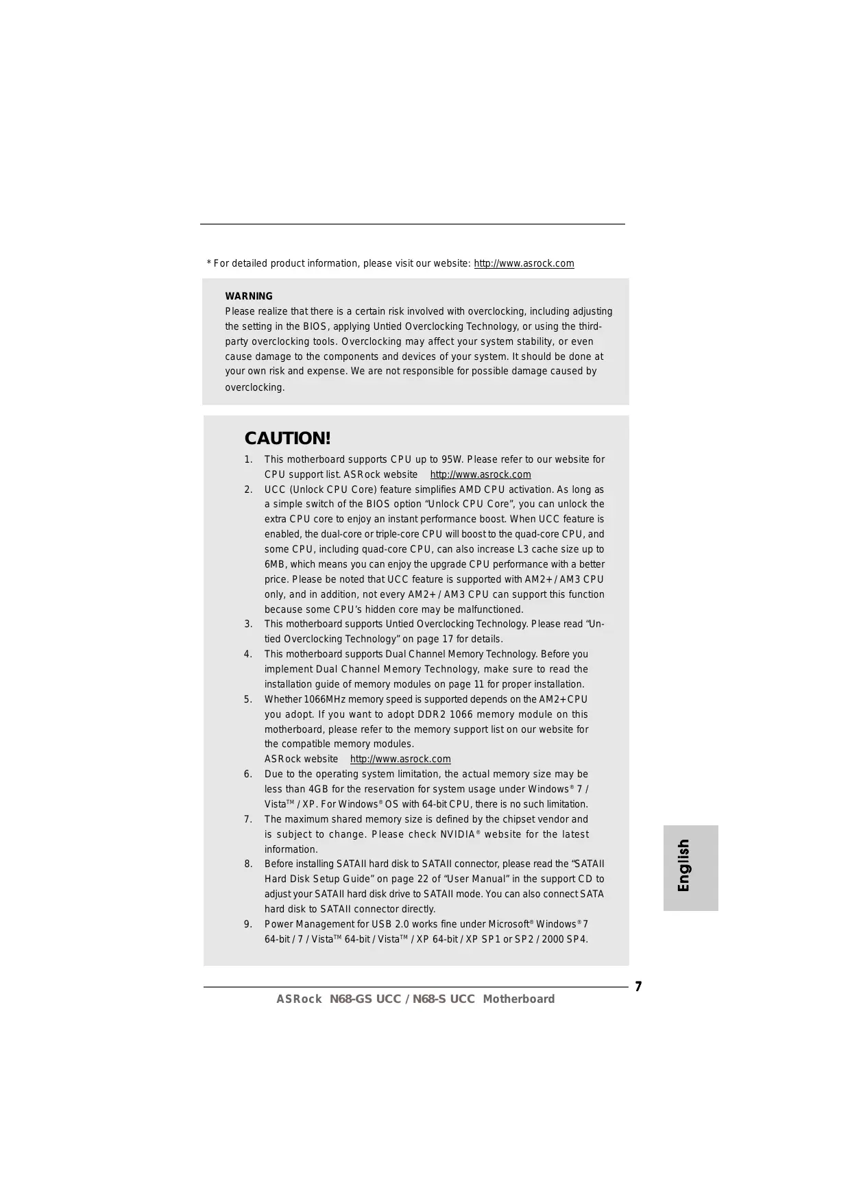 This motherboard supports CPU up to 95W. Please refer to our website for CPU support list. ASRock website http://www.asrock.com UCC (Unlock CPU Core) feature simplifies AMD CPU activation. As long as a simple switch of the BIOS option “Unlock CPU Core”, you can unlock the extra CPU core to enjoy an instant performance boost. When UCC feature is enabled, the dual-core or triple-core CPU will boost to the quad-core CPU, and some CPU, including quad-core CPU, can also increase L3 cache size up to 6MB, which means you can enjoy the upgrade CPU performance with a better price. Please be noted that UCC feature is supported with AM2+ / AM3 CPU only, and in addition, not every AM2+ / AM3 CPU can support this function because some CPU’s hidden core may be malfunctioned. This motherboard supports Untied Overclocking Technology. Please read “Untied Overclocking Technology” on page 17 for details. This motherboard supports Dual Channel Memory Technology. Before you implement Dual Channel Memory Technology, make sure to read the installation guide of memory modules on page 11 for proper installation. Whether 1066MHz memory speed is supported depends on the AM2+ CPU you adopt. If you want to adopt DDR2 1066 memory module on this motherboard, please refer to the memory support list on our website for the compatible memory modules. ASRock website http://www.asrock.com Due to the operating system limitation, the actual memory size may be less than 4GB for the reservation for system usage under Windows® 7 / VistaTM / XP. For Windows® OS with 64-bit CPU, there is no such limitation. The maximum shared memory size is defined by the chipset vendor and is subject to change. Please check NVIDIA ® website for the latest information. Before installing SATAII hard disk to SATAII connector, please read the “SATAII Hard Disk Setup Guide” on page 22 of “User Manual” in the support CD to adjust your SATAII hard disk drive to SATAII mode. You can also connect SATA hard disk to SATAII connector directly. Power Management for USB 2.0 works fine under Microsoft® Windows® 7 64-bit / 7 / VistaTM 64-bit / VistaTM / XP 64-bit / XP SP1 or SP2 / 2000 SP4. English