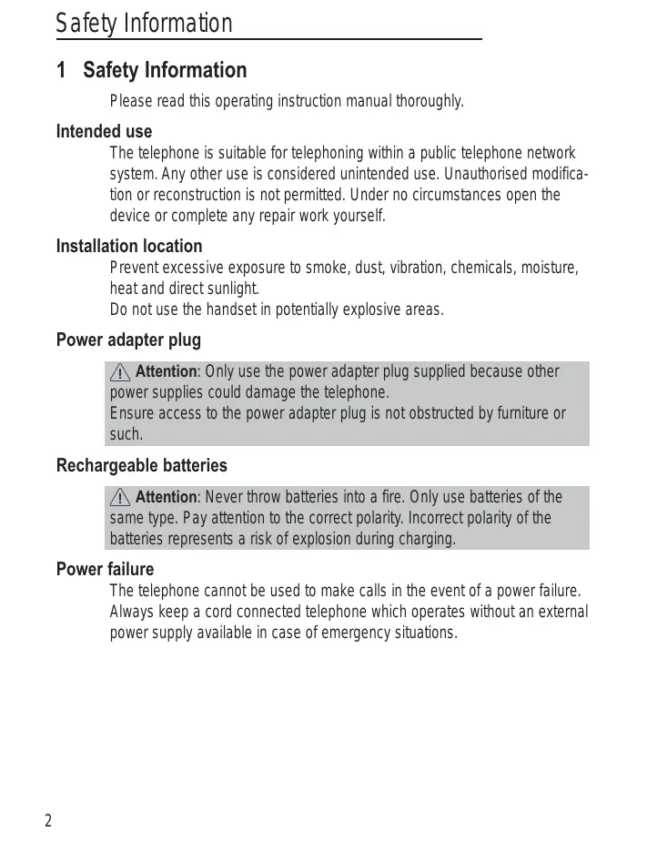 The telephone is suitable for telephoning within a public telephone network system. Any other use is considered unintended use. Unauthorized modification or reconstruction is not permitted. Under no circumstances open the device or complete any repair work yourself.