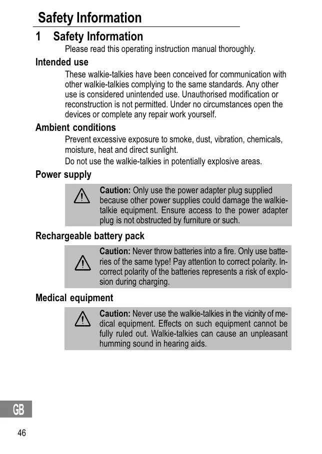Caution: Never use the walkie-talkies in the vicinity of medical equipment. Effects on such equipment cannot be fully ruled out. Walkie-talkies can cause an unpleasant humming sound in hearing aids.