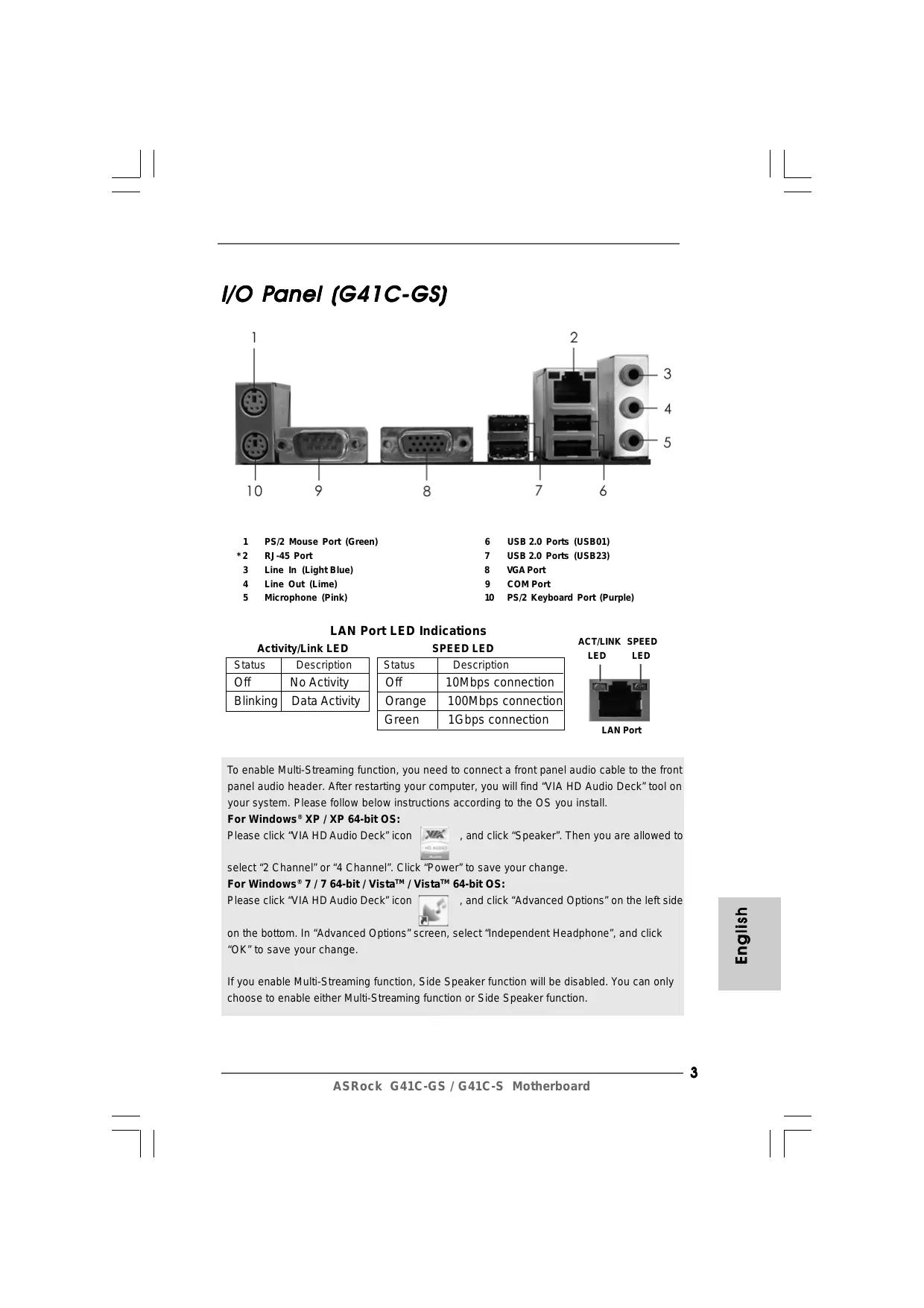 LED LED 10Mbps connection 100Mbps connection 1Gbps connection LAN Port To enable Multi-Streaming function, you need to connect a front panel audio cable to the front panel audio header. After restarting your computer, you will find “VIA HD Audio Deck” tool on your system. Please follow below instructions according to the OS you install. For Windows® XP / XP 64-bit OS: Please click “VIA HD Audio Deck” icon , and click “Speaker”. Then you are allowed to English select “2 Channel” or “4 Channel”. Click “Power” to save your change. For Windows® 7 / 7 64-bit / VistaTM / VistaTM 64-bit OS: Please click “VIA HD Audio Deck” icon , and click “Advanced Options” on the left side on the bottom. In “Advanced Options” screen, select “Independent Headphone”, and click “OK” to save your change. If you enable Multi-Streaming function, Side Speaker function will be disabled. You can only choose to enable either Multi-Streaming function or Side Speaker function.