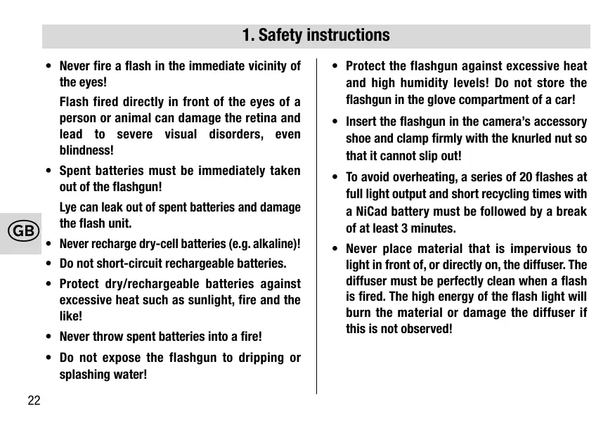 - Never fire a flash in the immediate vicinity of the eyes! Flash fired directly in front of the eyes of a person or animal can damage the retina and lead to severe visual disorders, even blindness!
