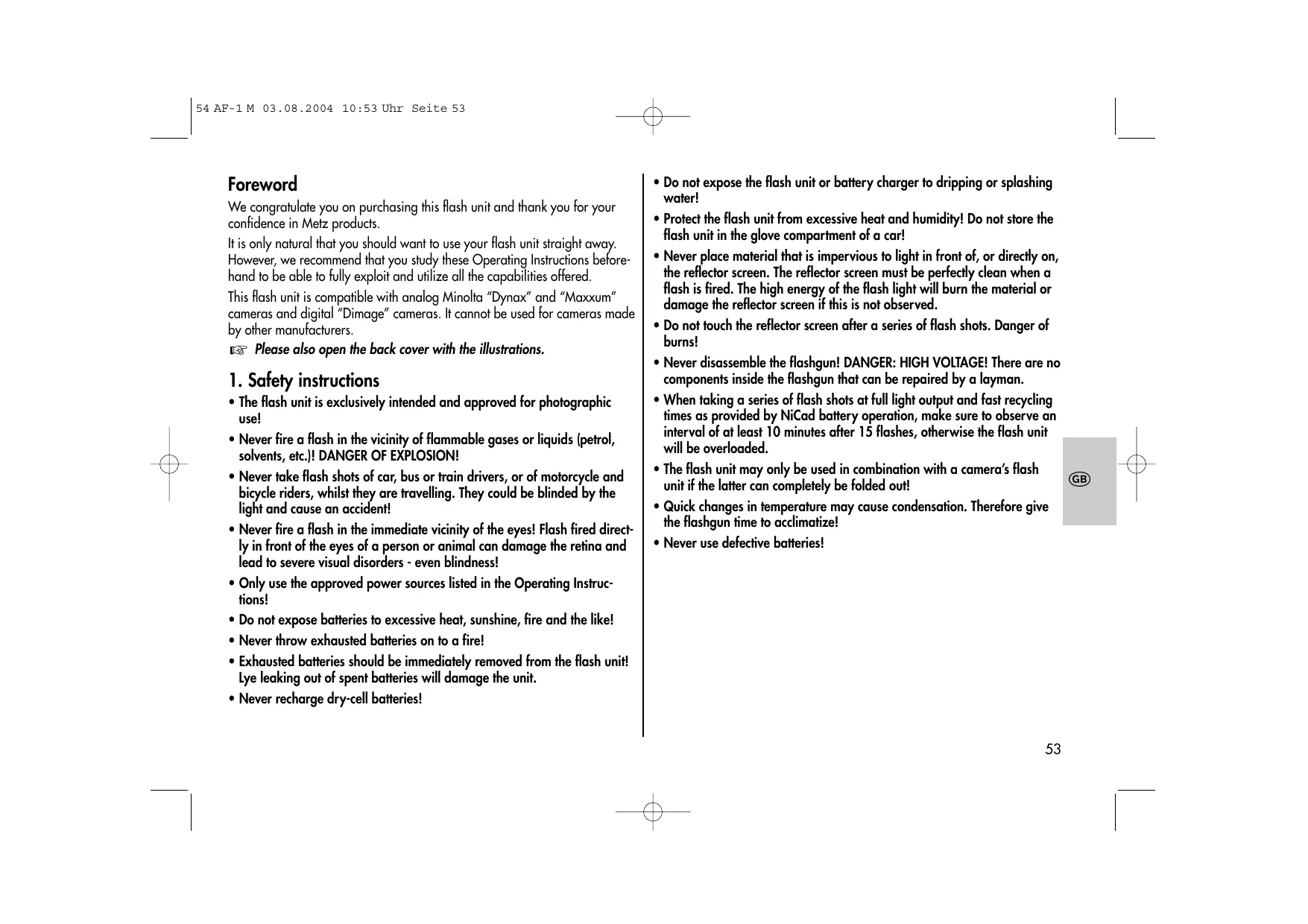 54 AF-1M 03.08.2004 10:53 Uhr Seite 53 Foreword We congratulate you on purchasing this flash unit and thank you for your confidence in Metz products. Itis only natural that you should want to use your flash unit straight av However, we recommend that you study these Operating Instructions before- hand to be able to fully exploit and uilize all he capabilties offered. This Alash unit is compatible with analog Minolta “Dynax” and “Maxrum” cameras and digital "Dimage” cameras. f cannot be used for cameras made by other manufacturers 15 Please also open the back cover with the illustrations.