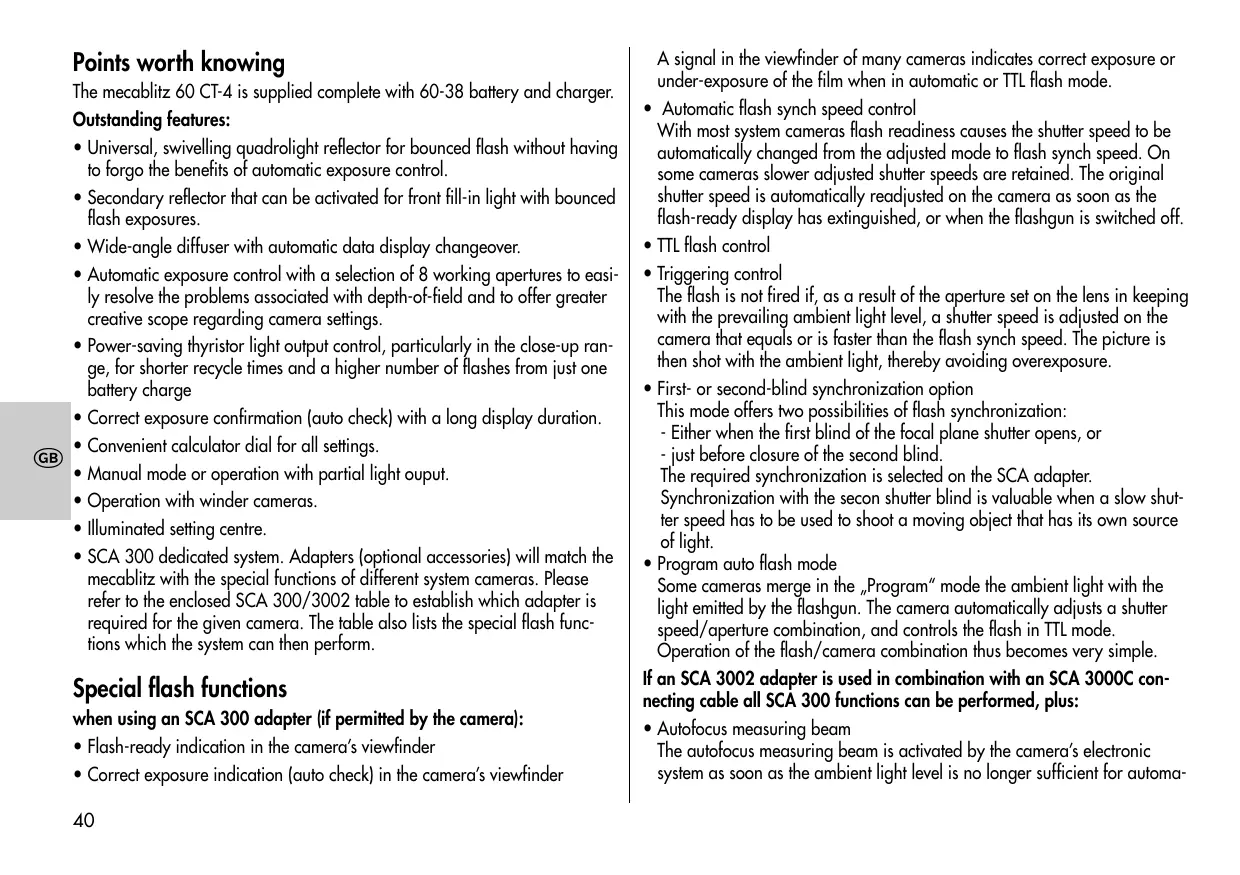 - 60 CT-4 with SCA 300/3002-adapter: TTL-flash mode*, Ch. 3, Page 43. Automatic flash mode, Ch. 4, Page 44. Manual flash mode, Ch. 5, Page 44. *Provided that the camera performs this function.