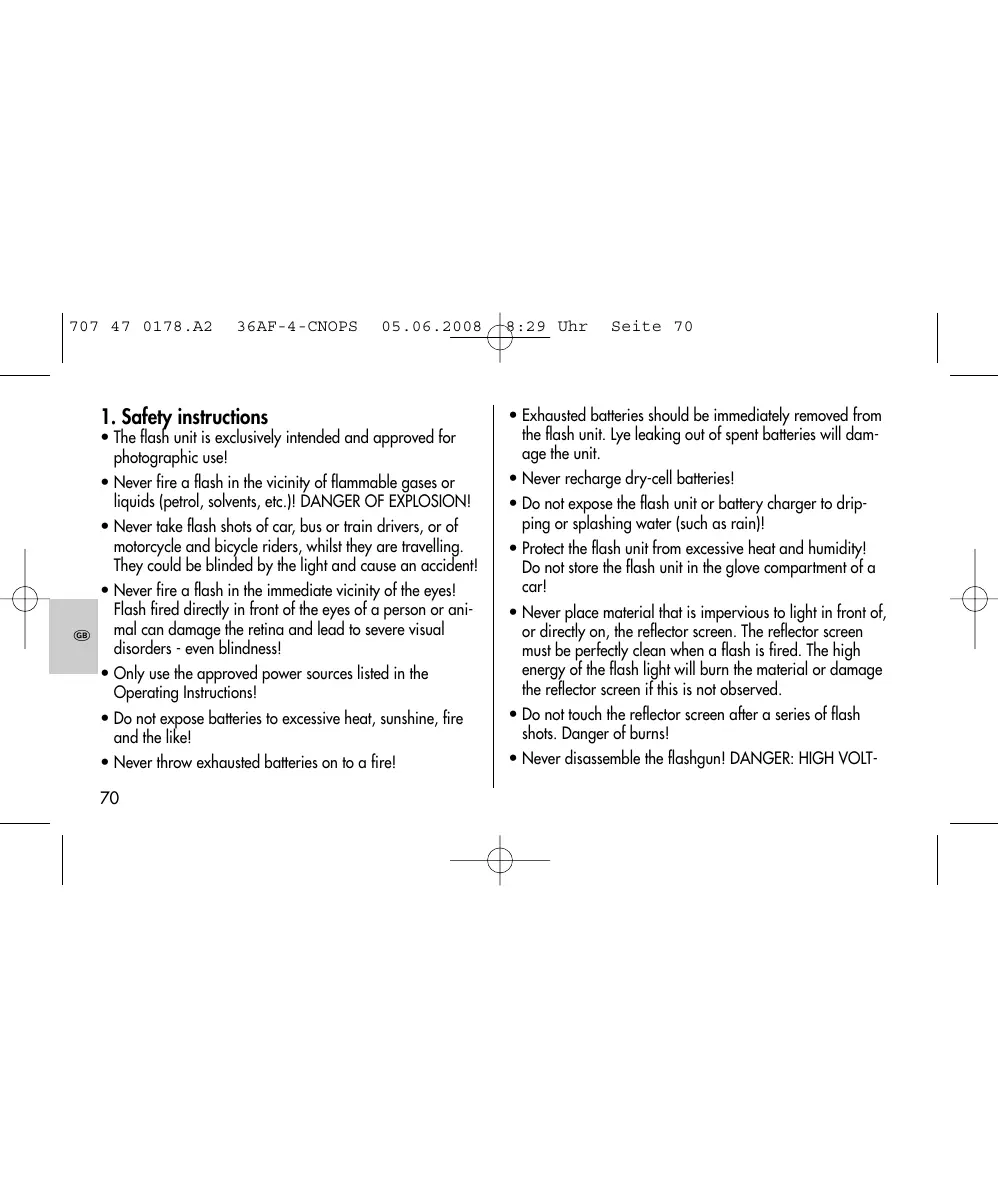 29 Uhr Seite 70 Exhausted boteries should be immediately removed from the flash unit. Lye leaking out of spent batieries will dam- age the unit. « Never recharge dry-cell batteries! + Do not expose the flash unit or battery charger to drip- ping or splashing water {such as rain]! + Protect the flash unit from excessive heat and humidity! Do not store the flash unit in the glove compariment of a car! + Never place material that is impervious to light in front of, or direaily on, the reflector screen. The reflector screen must be perfeclly clean when a flash is fred. The high energy of the flash light will burn the material or damage the reflector screen iF this is not observed. + Do not touch the reflector screen afier a series of flash shofs. Danger of burns! + Never disassemble the fashgun! DANGER: HIGH VOLT-
