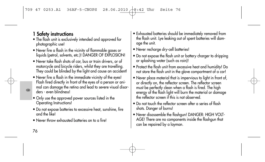 Seite 76 + Exhausted batteries should be immediately removed from the flash unit. Lye leaking out of spent batteries will dam- age the unit. + Never recharge dry-cell batteries! + Do not expose the flash unit or battery charger to dripping or splashing water {such as rain]! + Protect the flash unit from excessive heat and humidity! Do not store the flash unit in the glove compartiment of a car! + Never place material that is impervious to light in front of, PE or direcily on, the reflector screen. The reflector screen NP must be perfecty clean when a flash is fred. The high energy of he flash light will burn the material or damage the reflector screen if this is not observed. + Do not touch the reflector screen after a series of flash shoïs. Danger of burns! + Never disassemble the Aashgun! DANGER: HIGH VOLT- AGE! There are no components inside the flashgun that can be repaired by a loyman