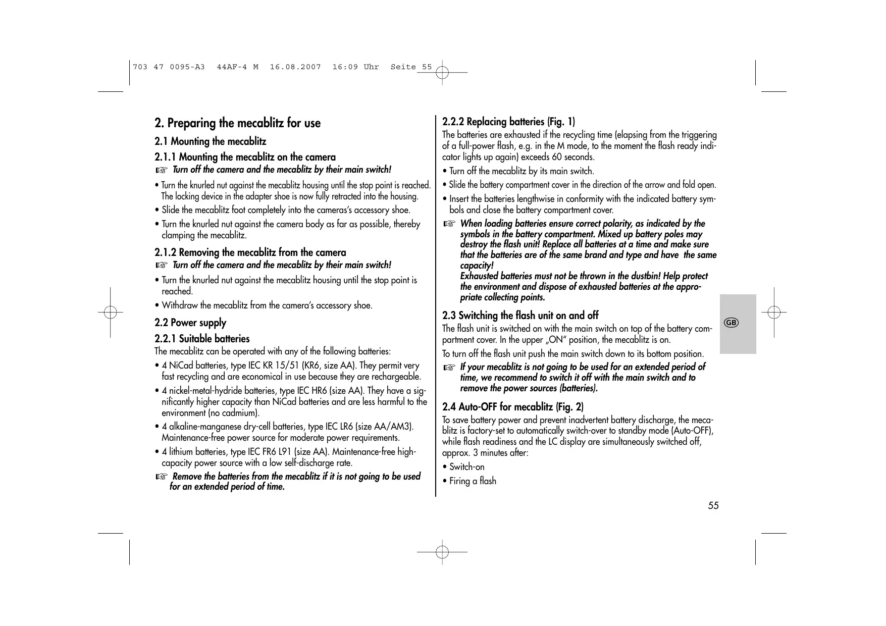 To save battery power and prevent inadvertent battery discharge, the meca- blitz is factory-set to automatically switch-over to standby mode (Auto-OFF], while Rlash readiness and the LC display are simultaneously switched of, approx. 3 minutes after: + Switch-on ° Firing a flash