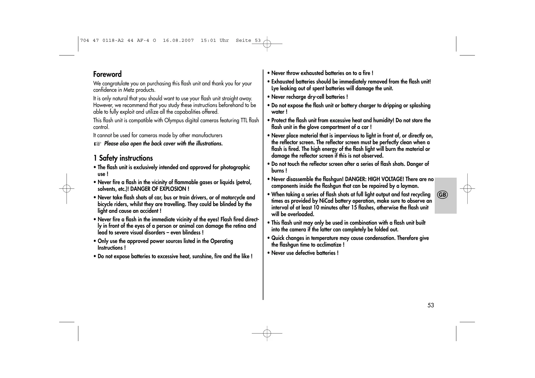ń 6.6 Autofocus-meetflits Foreword We congratulate you on purchasing this flash unit and thank you for your confidence in Metz products. It is only natural that you should want to use your flash unit straight away. However, we recommend that you study these instructions beforehand to be able to fully exploit and utilize all the capabalities offered. This flash unit is compatible with Olympus digital cameras featuring TTL flash control. It cannot be used for cameras made by other manufacturers ☞ Please also open the back cover with the illustrations. 1 Safety instructions