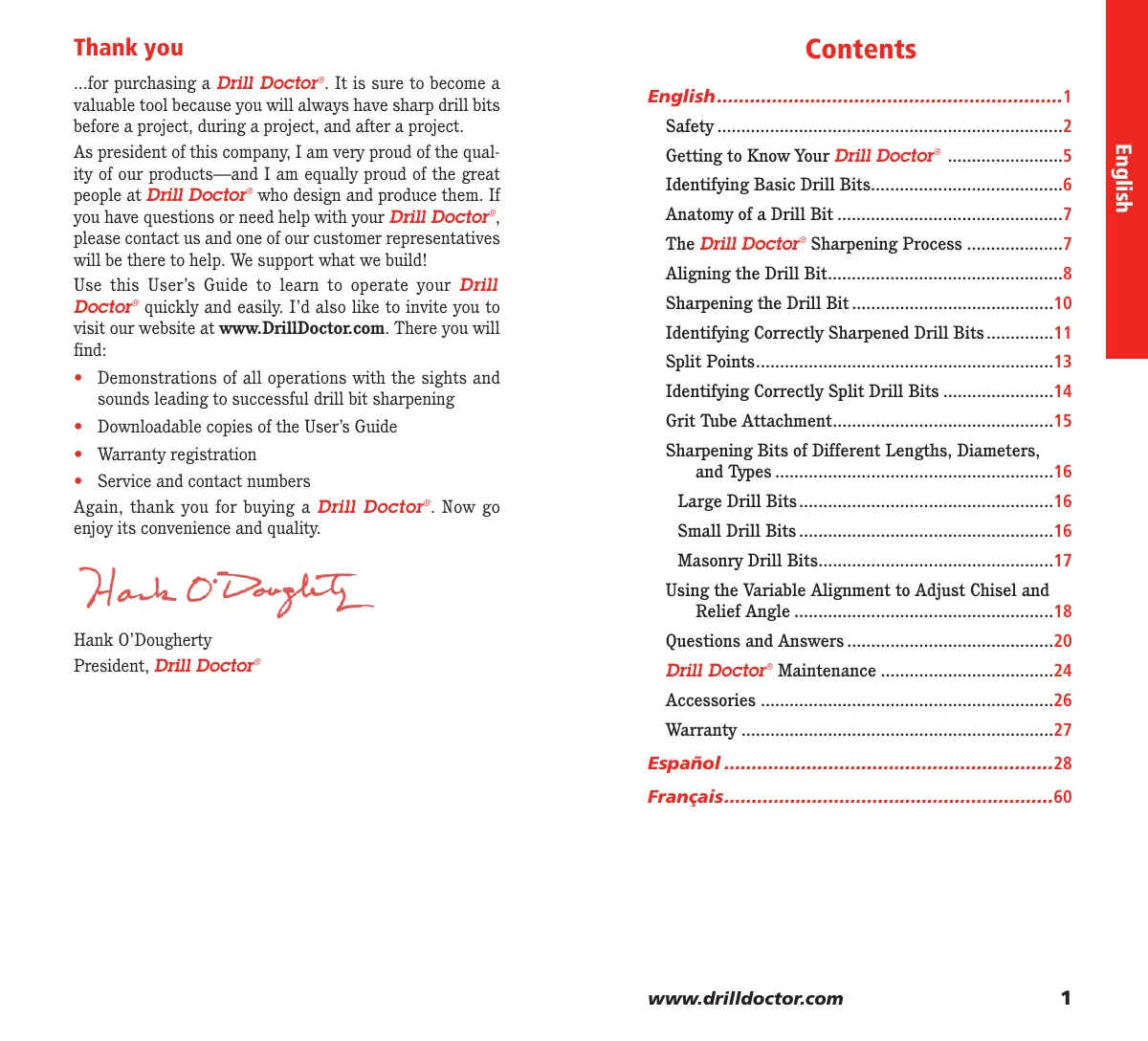 Use this User's Guide to learn to operate your Drill Doctor quickly and easily. I'd also like to invite you to visit our website at www.DrillDoctor.com. There you will find:
