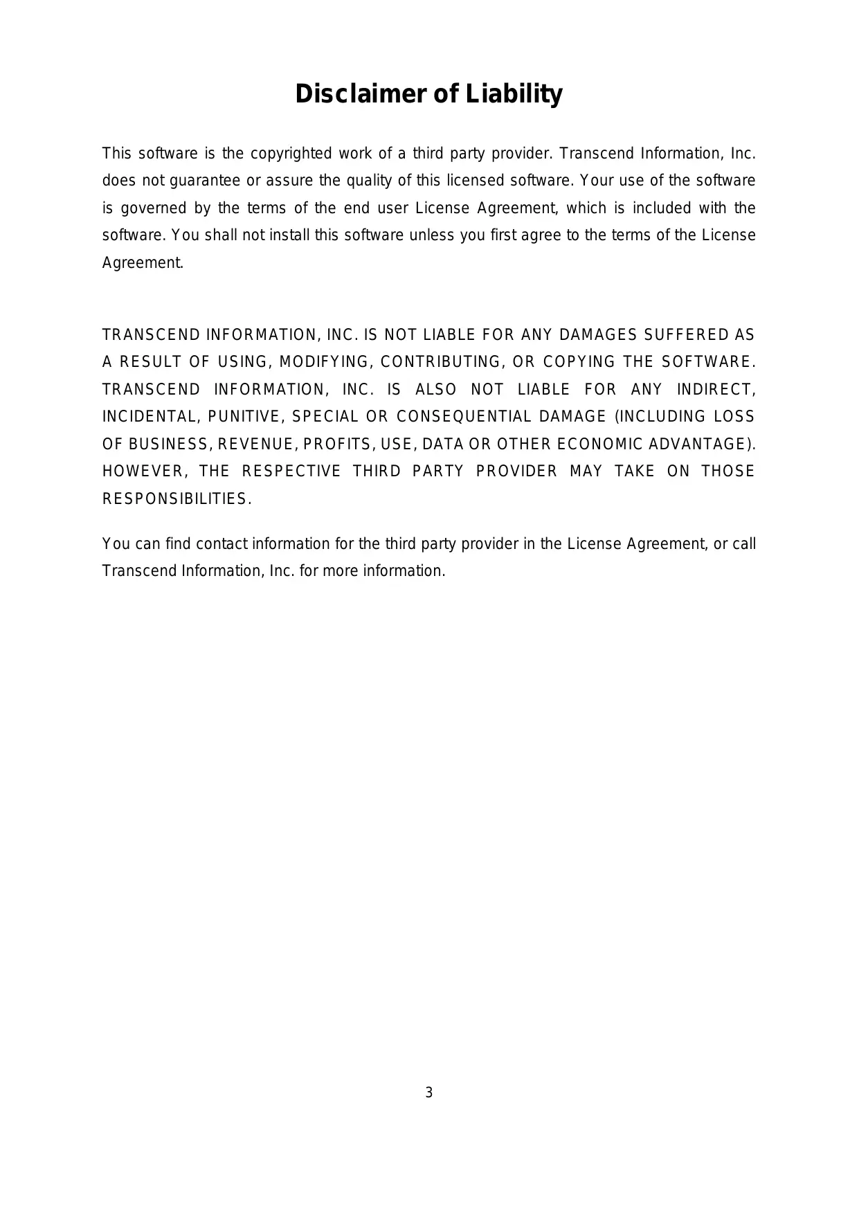 TRANSCEND INFORMATION, INC. IS NOT LIABLE FOR ANY DAMAGES SUFFERED AS A RESULT OF USING, MODIFYING, CONTRIBUTING, OR COPYING THE SOFTWARE. TRANSCEND INFORMATION, INC. IS ALSO NOT LIABLE FOR ANY INDIRECT, INCIDENTAL, PUNITIVE, SPECIAL OR CONSEQUENTIAL DAMAGE (INCLUDING LOSS OF BUSINESS, REVENUE, PROFITS, USE, DATA OR OTHER ECONOMIC ADVANTAGE). HOWEVER, THE RESPECTIVE THIRD PARTY PROVIDER MAY TAKE ON THOSE RESPONSIBILITIES.